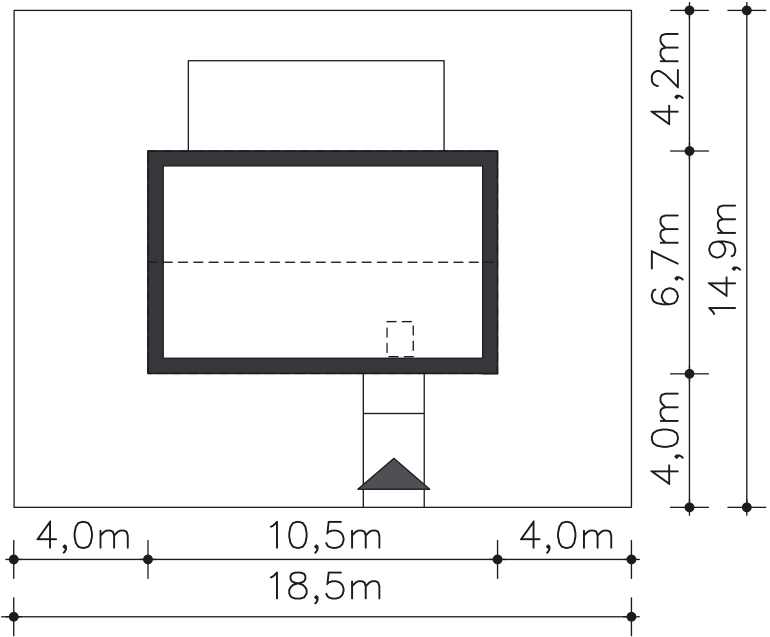 Grafika przedstawia minimalne wymiary działki. Aby sprawdzić, czy dom może być realizowany na konkretnej działce należy uzyskać Wypis i Wyrys z Miejscowego Planu Zagospodarowania Przestrzennego lub jeśli na danym terenie nie ma planu – Decyzję o warunkach zabudowy. Wszystkie projekty wymagają adaptacji do warunków miejscowych przez projektanta lokalnego.