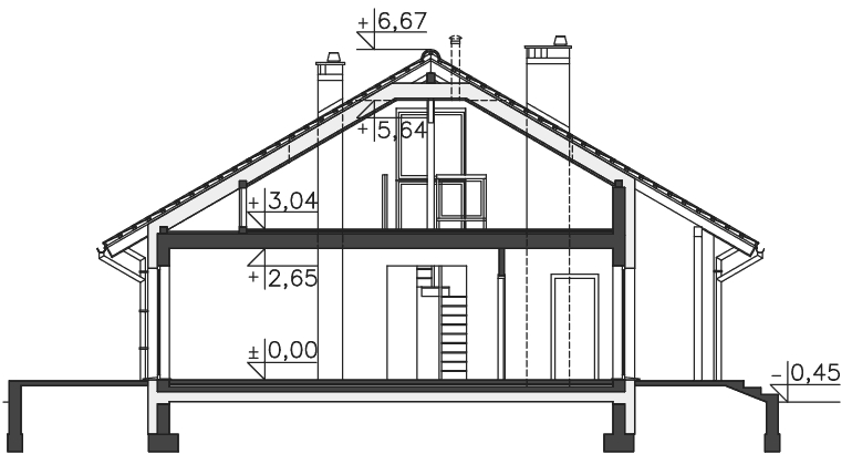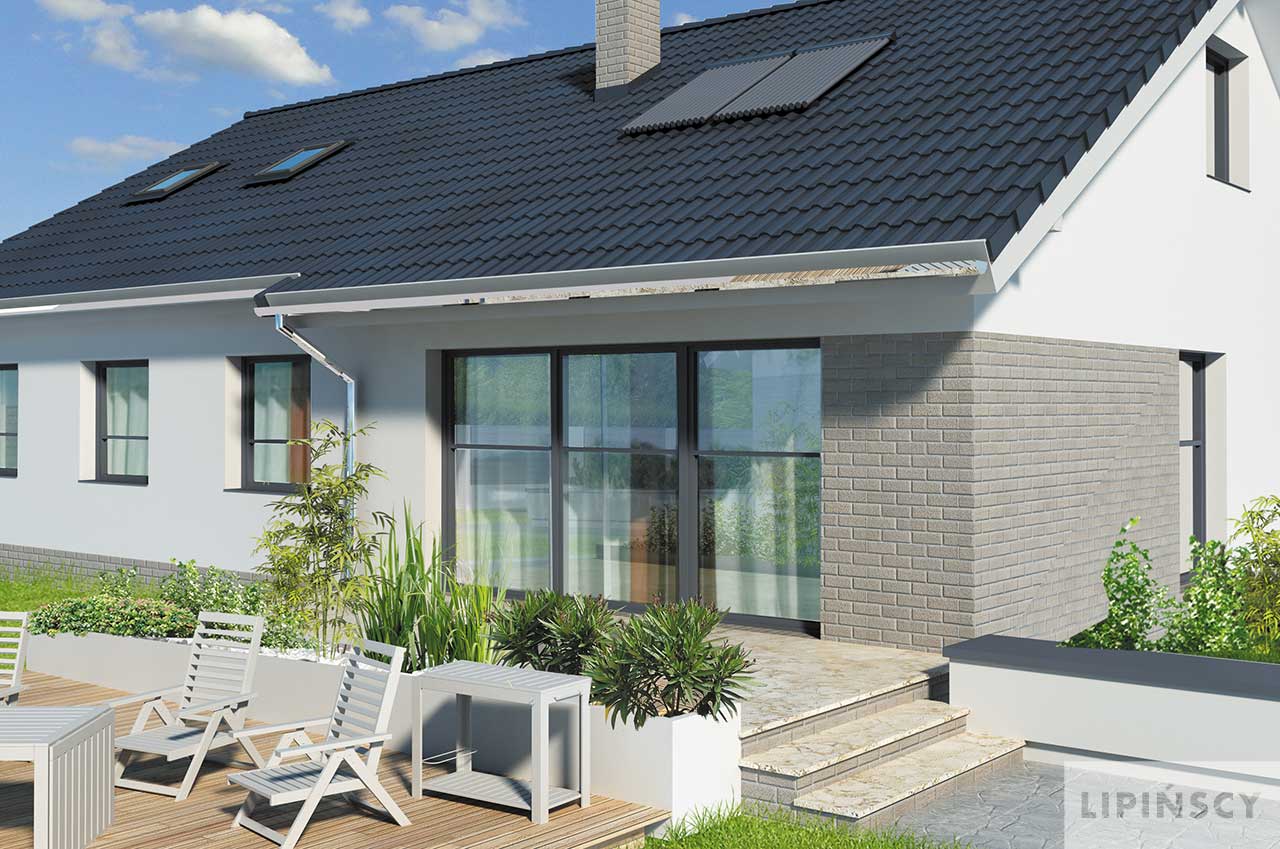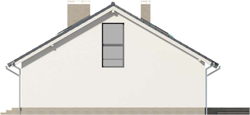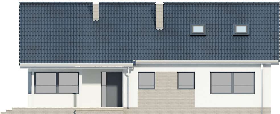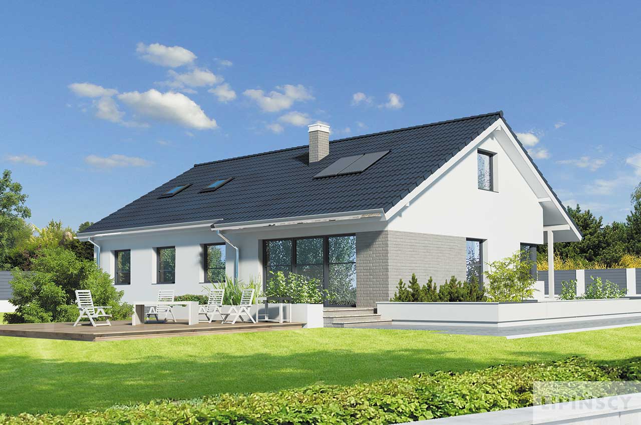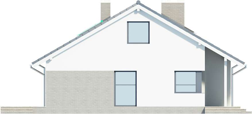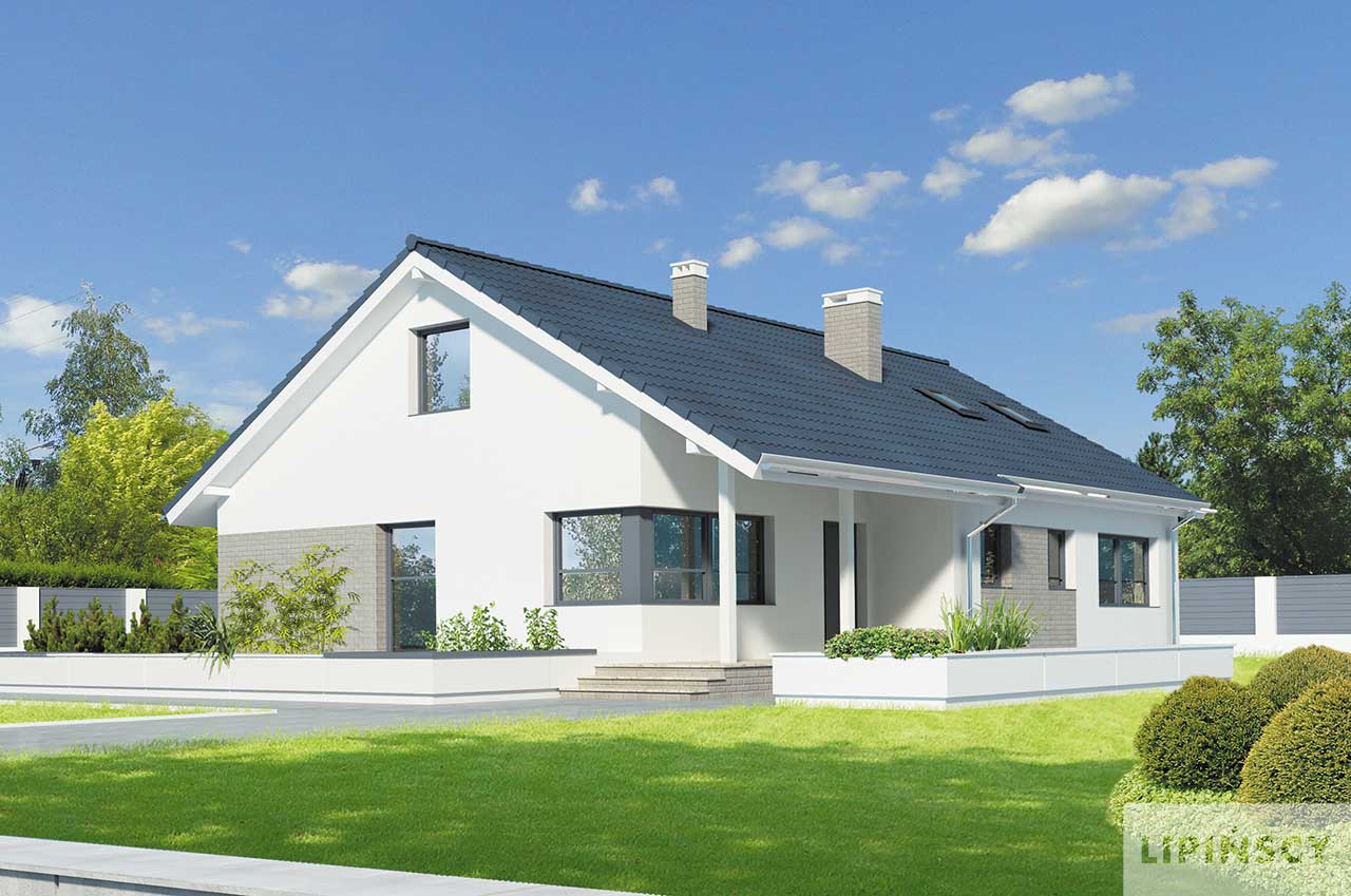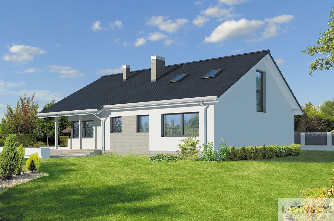 Prosty dom parterowy z dwuspadowym dachem, z możliwością wykorzystania poddasza, doskonały dla 4-5 osobowej rodziny. Dom przewidziano bez garażu, a zlokalizowanie od frontu części dziennej pozwala na zlokalizowanie go na działkach z wjazdem od południa. Parter został podzielony między strefę dzienną – duży salon z miejscem na rodzinny stół i otwartą na niego kuchnię, toaletę i pomieszczenie gospodarcze. Strefa prywatna to trzy mniejsze i jedna większa sypialnia oraz duża wspólna łazienka. Poddasze, o powierzchni niemal 60m² daje duże możliwości aranżacyjne i w zależności od potrzeb można je przeznaczyć na kącik wypoczynkowy, dodatkową sypialnię, czy studio. Uwagę zwraca zadaszone wejście oraz narożne okna. Prosta bryła i architektura sprawiają, że dom jest nieskomplikowany i niedrogi w budowie. W projekcie przewidziano ogrzewanie kotłem na gaz. Możliwa jest zmiana ogrzewania na pompę ciepła.