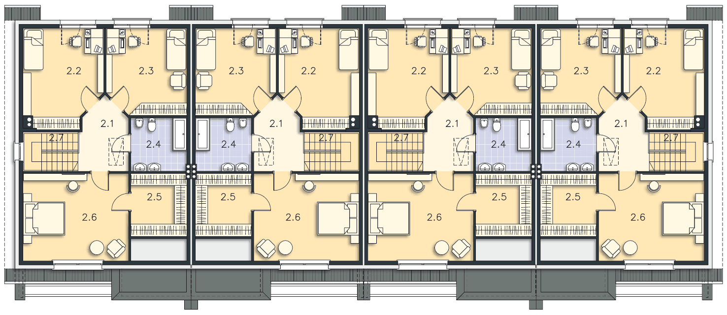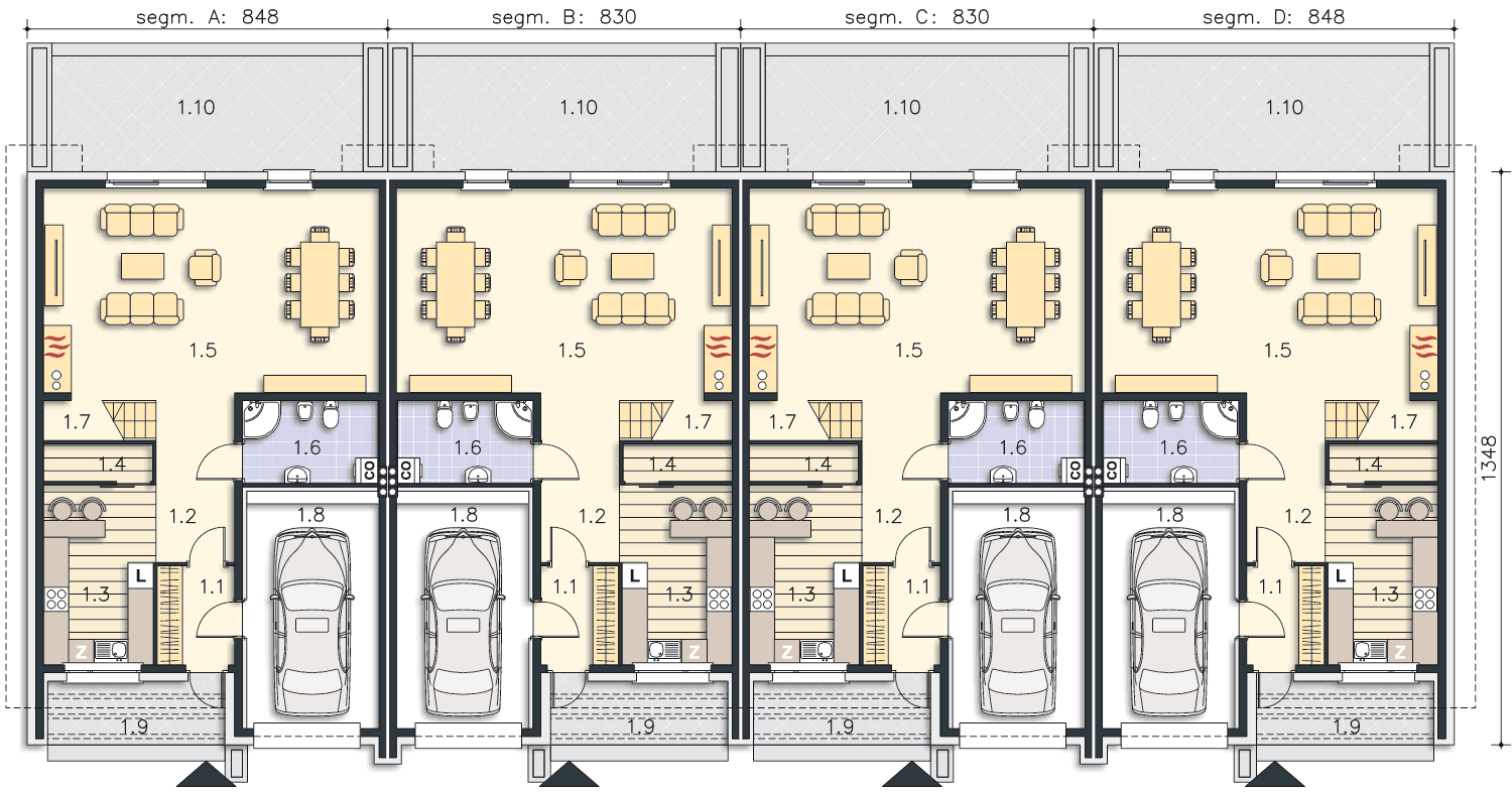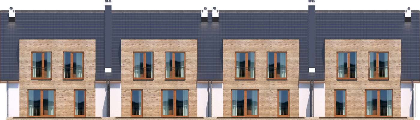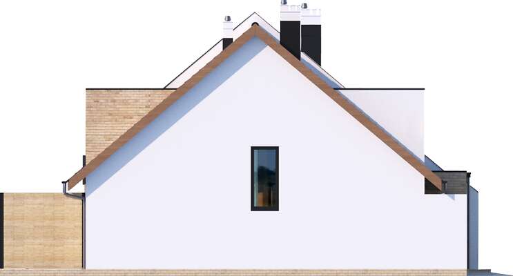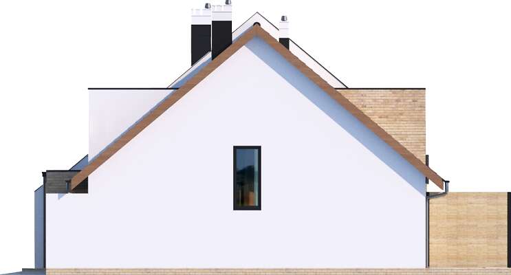 Przestronny dom przystosowany do zabudowy szeregowej, idealny dla czteroosobowej rodziny. Na parterze do dyspozycji mieszkańców jest niezależna kuchnia ze spiżarnią, garaż, łazienka oraz duży salon, w którym znajdzie się miejsce na rodzinny stół. Piętro to strefa nocna – sypialnia rodziców z własną garderobą i dwie sypialnie dla dzieci oraz łazienka. W projekcie przewidziano ogrzewanie kotłem na gaz. Możliwa jest zmiana ogrzewania na pompę ciepła.
