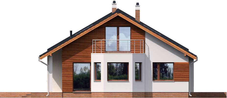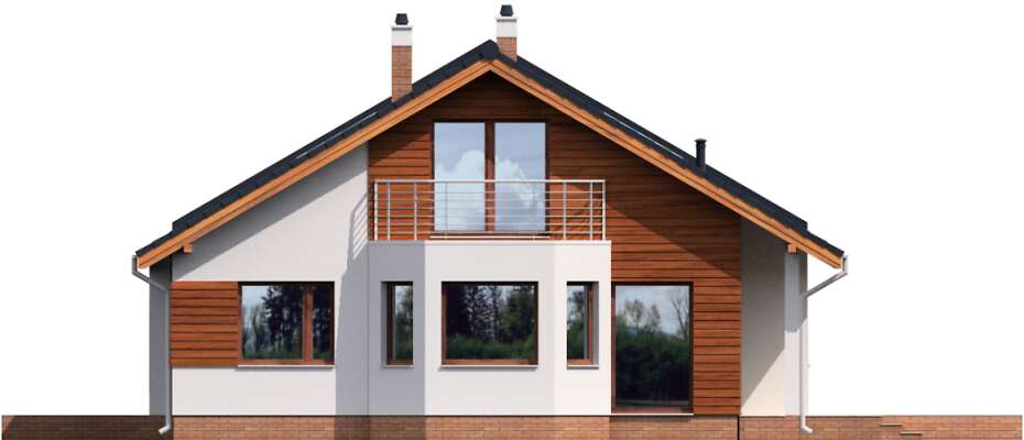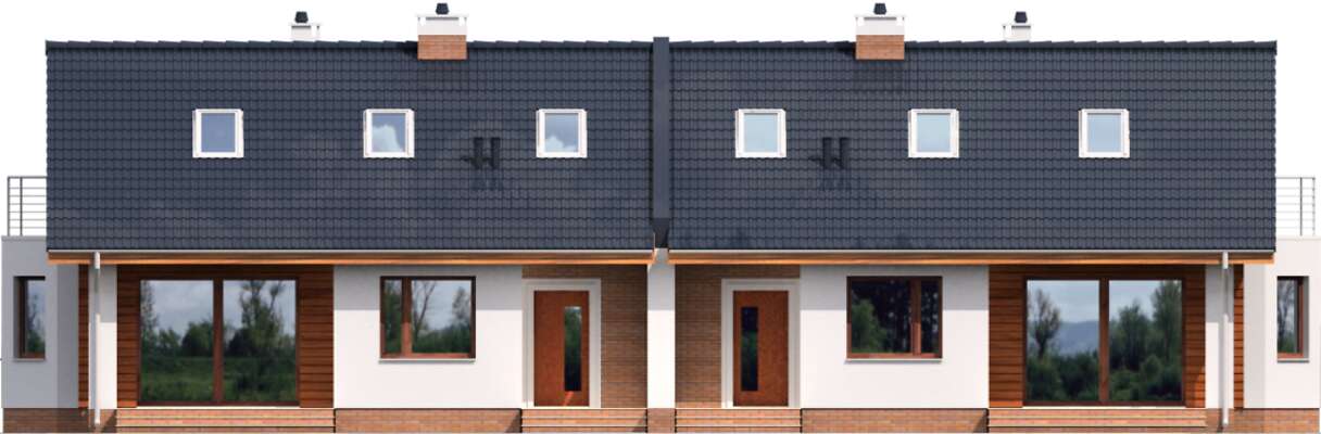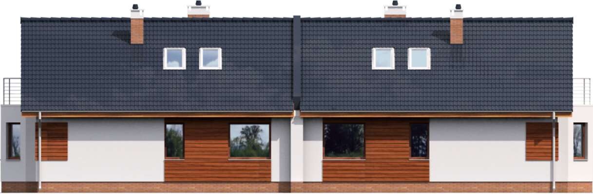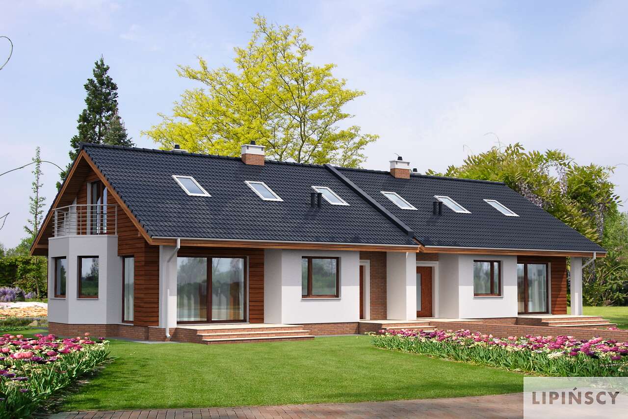 Wygodny dom do zabudowy bliźniaczej, w którym parter i poddasze przewidziane zostały jako niezależne strefy, dzięki czemu mogą w nim zamieszkać dwa pokolenia. Parter mieści obszerny pokój dzienny z aneksem jadalnym i otwartą na niego kuchnię. Są tu także dwie sypialnie, łazienka i pomieszczenie gospodarcze. Schody, usytuowane w hallu, prowadzą na poddasze, gdzie zlokalizowano aneks kuchenny z częścią wypoczynkową, wygodną łazienkę oraz obszerną sypialnię, z której można wyjść na niewielki balkon.