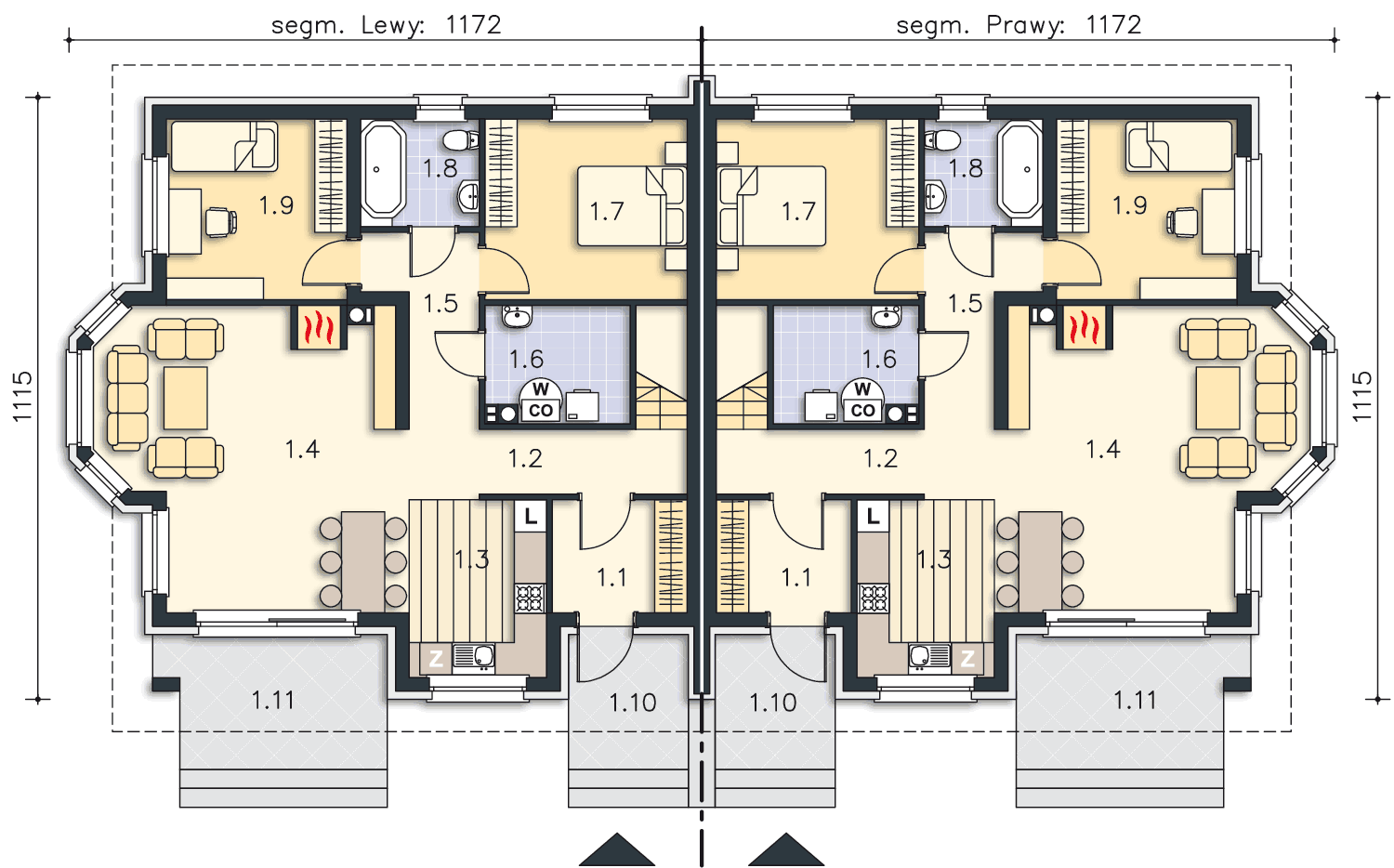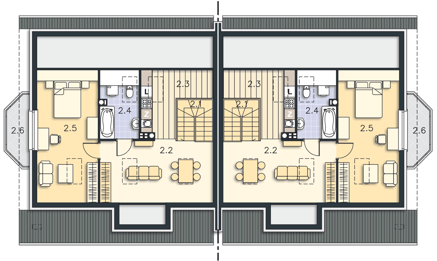 Szacunkowe koszty realizacji dotyczą jednej połówki bliźniaka. Jeśli chodzi o włączanie powierzchni poddasza, to nie ma możliwości przesunięcia ścian dzielących obie połówki, ale można jedną z części poddasza połączyć drzwiami z drugą. Pod względem prawnym jednak taki dom musiałby być realizowany na jednej działce i nazywać się domem jednorodzinnym dwulokalowym, a nie w zabudowie bliźniaczej.