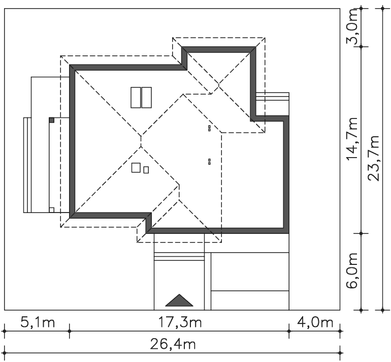 Grafika przedstawia minimalne wymiary działki. Aby sprawdzić, czy dom może być realizowany na konkretnej działce należy uzyskać Wypis i Wyrys z Miejscowego Planu Zagospodarowania Przestrzennego lub jeśli na danym terenie nie ma planu – Decyzję o warunkach zabudowy. Wszystkie projekty wymagają adaptacji do warunków miejscowych przez projektanta lokalnego.