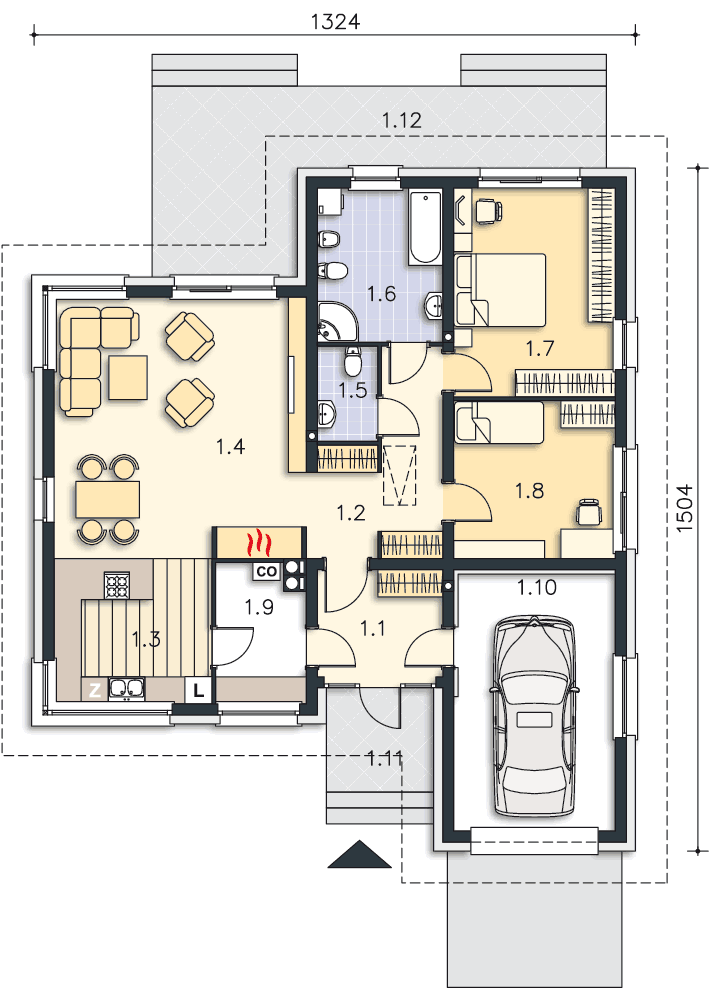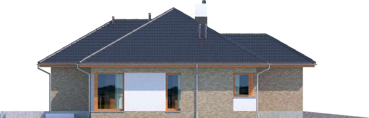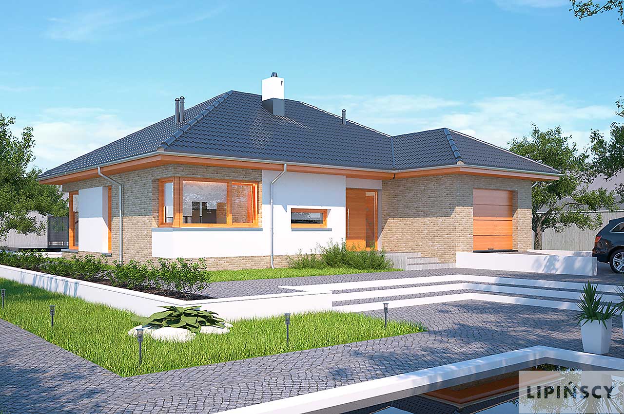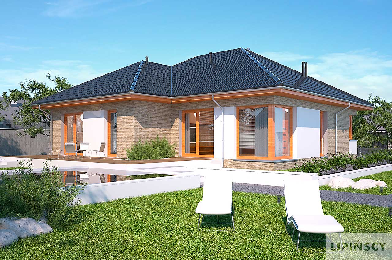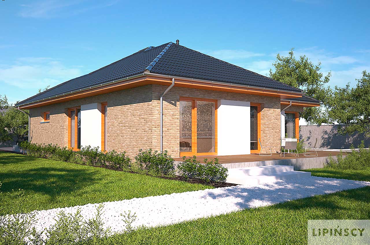 Przestronny dom jednorodzinny, parterowy, z wyraźnie wydzieloną funkcją dzienną i nocną. W części wspólnej - dziennej, znajduje się wygodny salon z kominkiem, miejscem na stół do posiłków, a obok zlokalizowana została kuchnia z wyspą, z którą sąsiaduje niezbędna w każdym domu spiżarnia. Część nocna - prywatna to dwie sypialnie, łazienka i toaleta. Z domu można przejść bezpośrednio do garażu. Uwagę zwraca ładna, harmonijna bryła budynku, z klinkierowymi elementami elewacji, przekryta wielospadowym dachem.
