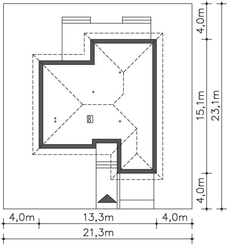 Grafika przedstawia minimalne wymiary działki. Aby sprawdzić, czy dom może być realizowany na konkretnej działce należy uzyskać Wypis i Wyrys z Miejscowego Planu Zagospodarowania Przestrzennego lub jeśli na danym terenie nie ma planu – Decyzję o warunkach zabudowy. Wszystkie projekty wymagają adaptacji do warunków miejscowych przez projektanta lokalnego.