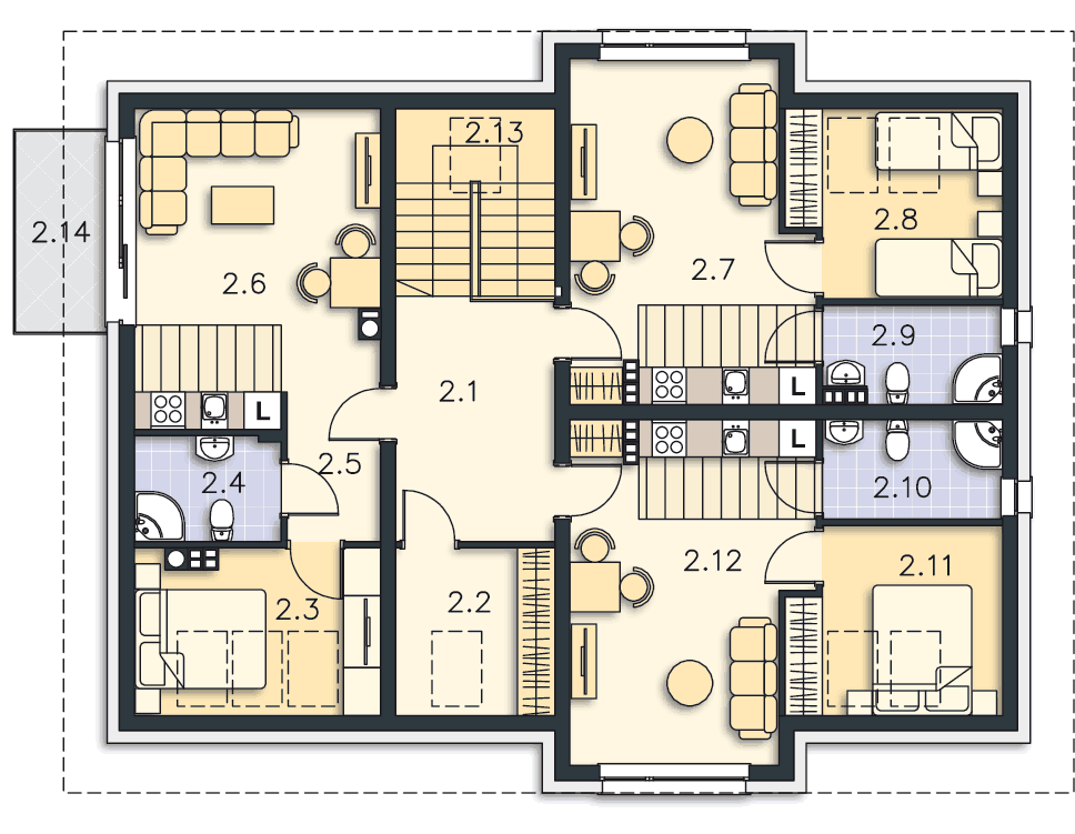 Budynek mieszkalny jednorodzinny z pokojami na wynajem, możliwy do wykorzystania jako obiekt agroturystyczny na terenach do tego przeznaczonych. Przestronny dom, w którym goście poczują się komfortowo i przytulnie. Na parterze znajduje się wspólny salon. Jest tu także toaleta, pomieszczenie co i pomieszczenie gospodarcze – magazyn. Przewidziano także miejsce na dwa apartamenty, z których każdy posiada salonik z aneksem kuchennym, sypialnię oraz łazienkę. Na poddaszu zaprojektowano trzy kolejne apartamenty z salonem, mini kuchnią, sypialnią i łazienką. Garderoba może być udostępniona dla gości lub służyć na cele gospodarcze.