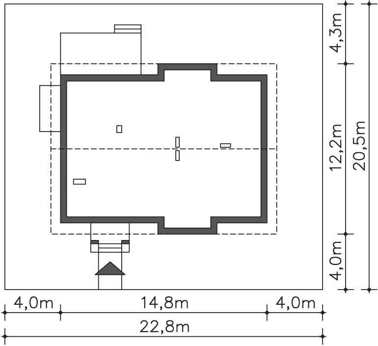 Grafika przedstawia minimalne wymiary działki. Aby sprawdzić, czy dom może być realizowany na konkretnej działce należy uzyskać Wypis i Wyrys z Miejscowego Planu Zagospodarowania Przestrzennego lub jeśli na danym terenie nie ma planu – Decyzję o warunkach zabudowy. Wszystkie projekty wymagają adaptacji do warunków miejscowych przez projektanta lokalnego.