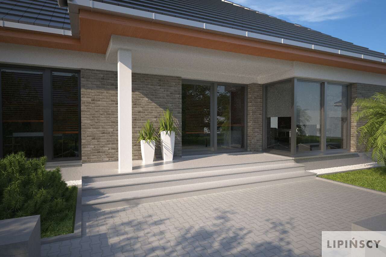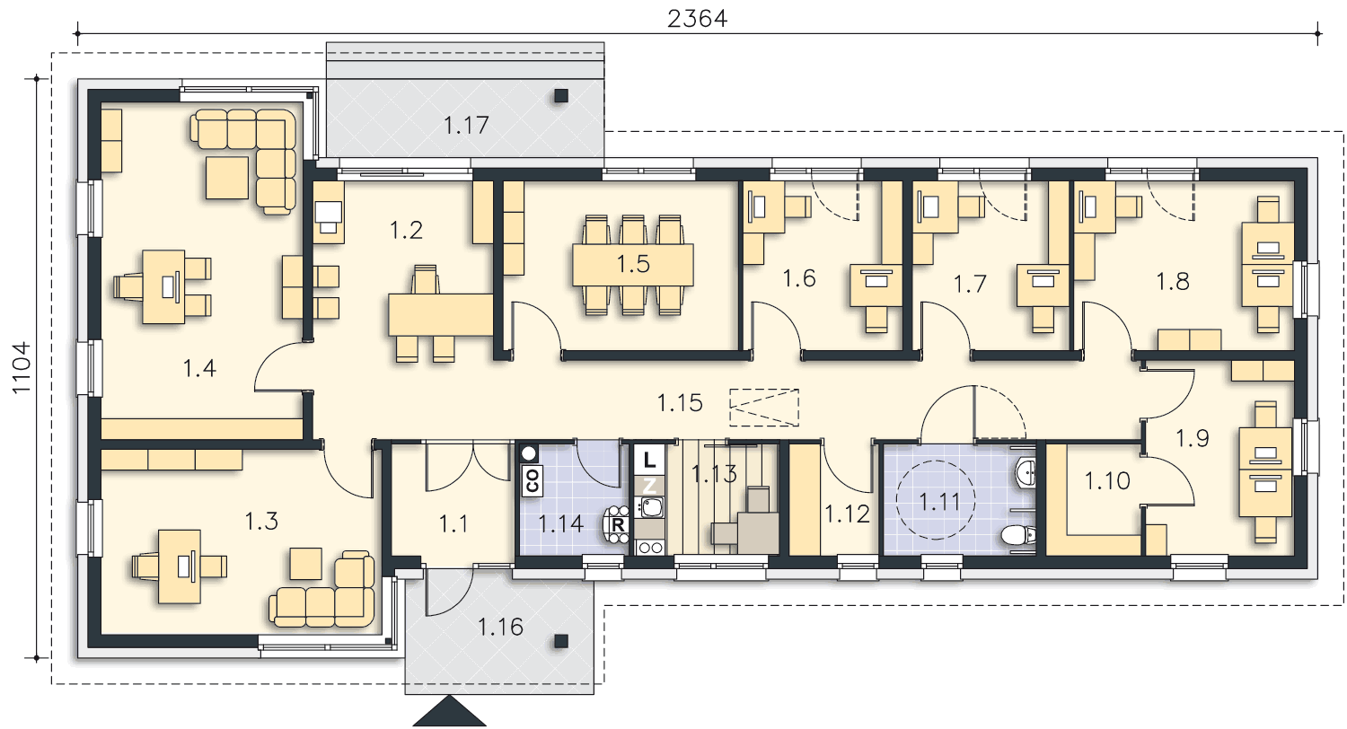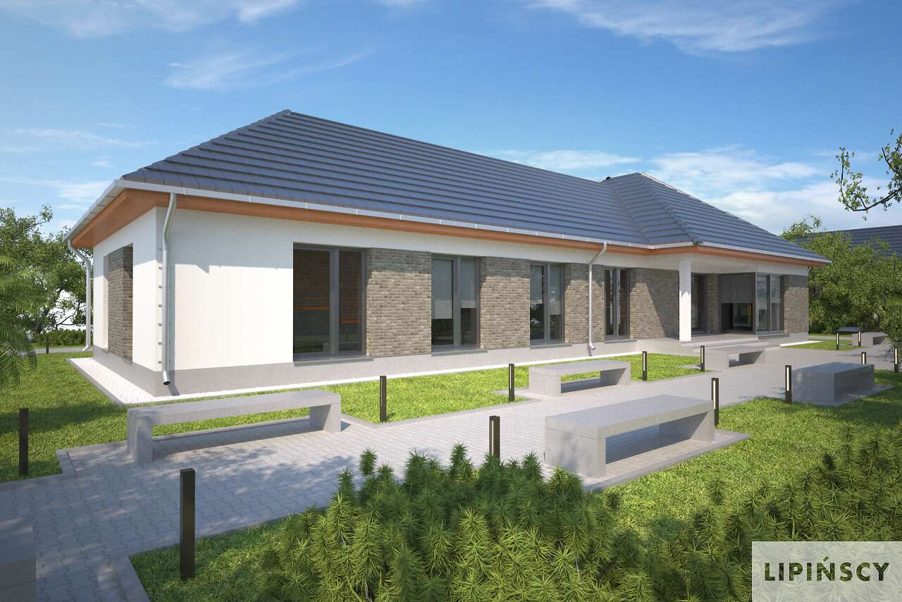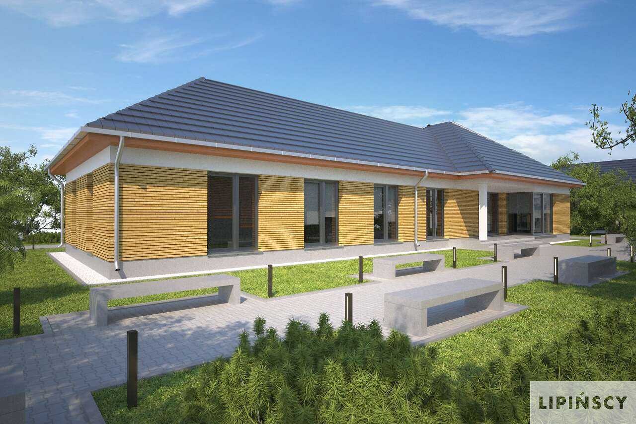 Budynek w standardzie energooszczędnym, przeznaczony na działalność biurową lub usługową. Przestrzeń podzielona została na część, gdzie można zlokalizować recepcję z poczekalnią, dwie większe sale biurowe, salę konferencyjną, cztery gabinety, zaplecze gospodarcze, archiwum, pomieszczenie socjalne (kuchnię), łazienkę i toaletę. Uwagę zwraca atrakcyjna bryła, o nowoczesnym rysie, z drewnianymi elementami elewacji. W projekcie przewidziano ogrzewanie kotłem na gaz. Możliwa jest zmiana ogrzewania na pompę ciepła.