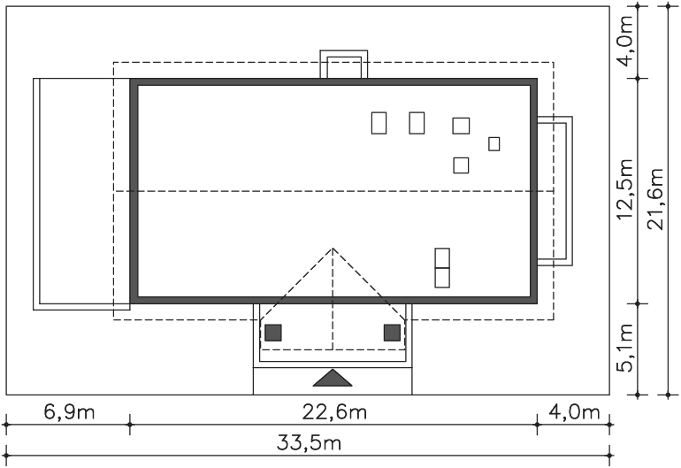 Grafika przedstawia minimalne wymiary działki. Aby sprawdzić, czy dom może być realizowany na konkretnej działce należy uzyskać Wypis i Wyrys z Miejscowego Planu Zagospodarowania Przestrzennego lub jeśli na danym terenie nie ma planu – Decyzję o warunkach zabudowy. Wszystkie projekty wymagają adaptacji do warunków miejscowych przez projektanta lokalnego.