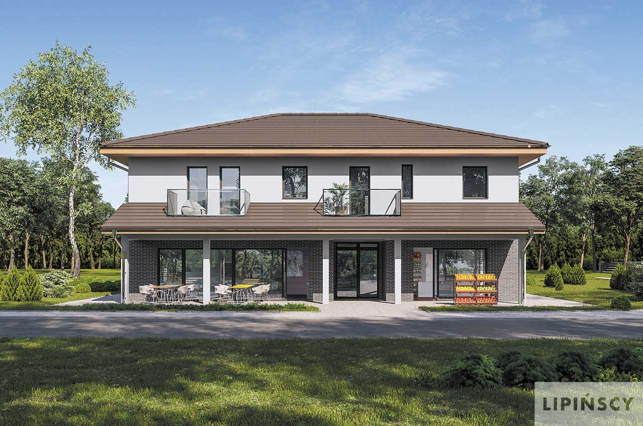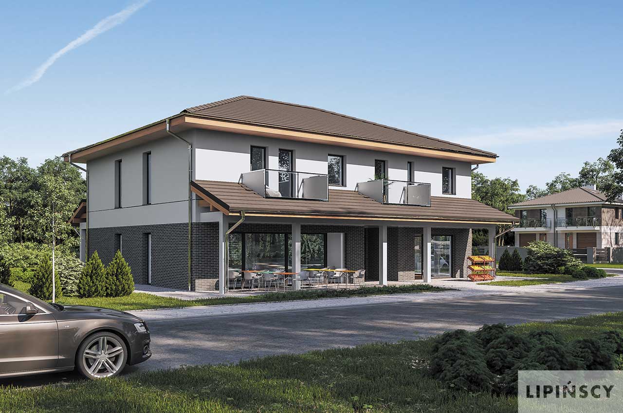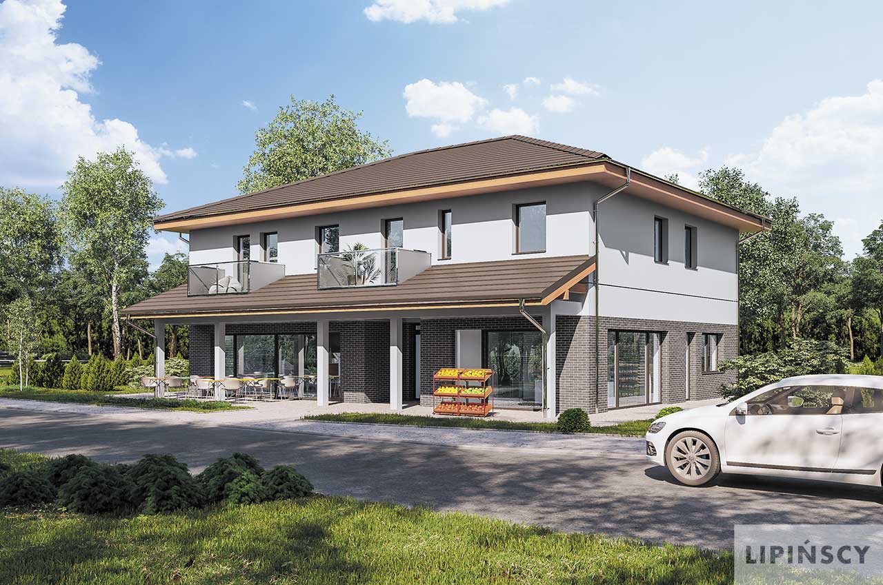 Nowość w naszej ofercie: gotowy projekt budynku usługowego z częścią mieszkalną. Czysta forma, nowoczesny i elegancki detal, oraz dobrze rozplanowane wnętrze czynią ten projekt idealnym dla Twojej działalności. Budynek mieści cztery wygodne, niewielkie mieszkania, każde z balkonem oraz przestrzeń usługową usytuowaną na parterze. Znajdują się tu dwa niezależne lokale usługowe, każde z własną częścią socjalno-sanitarną. Lokale mogą być zaadoptowane do różnorodnych usług czy handlu. Strefa wejściowa wzbogacona jest o zadaszoną przestrzeń. Zapytaj o ten projekt lub o ofertę projektów budynków usługowych tworzonych według indywidualnych potrzeb.