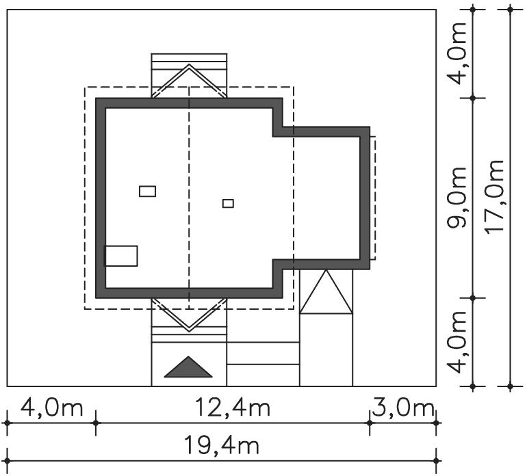 Grafika przedstawia minimalne wymiary działki. Aby sprawdzić, czy dom może być realizowany na konkretnej działce należy uzyskać Wypis i Wyrys z Miejscowego Planu Zagospodarowania Przestrzennego lub jeśli na danym terenie nie ma planu – Decyzję o warunkach zabudowy. Wszystkie projekty wymagają adaptacji do warunków miejscowych przez projektanta lokalnego.