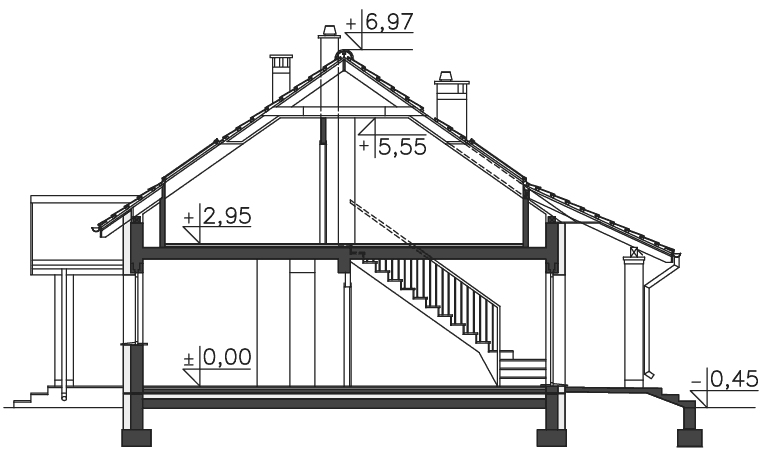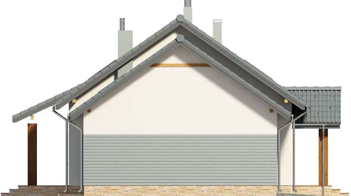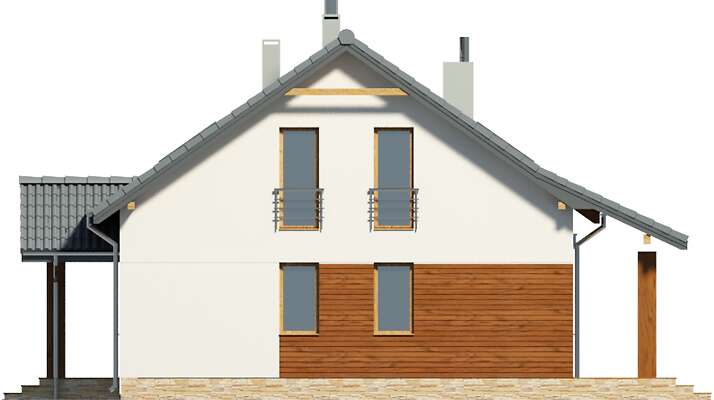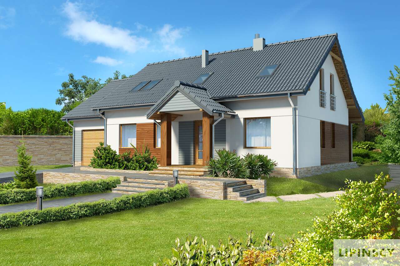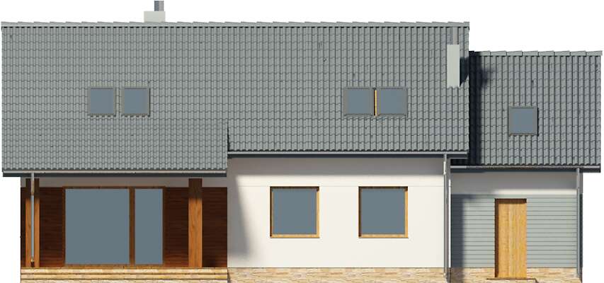 Wersja bez lukarn projektu Calgary (LMP161). Jest to budynek o prostej bryle, przykrytej dwuspadowym dachem. W dachu umieszczono okna połaciowe, które zapewniają dobre doświetlenie pomieszczeń na poddaszu. W propozycji elewacji zastosowano niesymetryczne akcenty szarego tynku przeplatane okładzinami drewnianymi, co nadaje budynkowi nowoczesnego rysu. Zadaszenie w całości tarasu ogrodowego pozwoli na korzystanie z niego niezależnie od pogody. Dom posiada wygodne pomieszczenia dodatkowe: strych nad garażem, który służyć może np. za suszarnię, duże pomieszczenie c.o., schowek przy wejściu oraz na poddaszu wygodne garderoby.