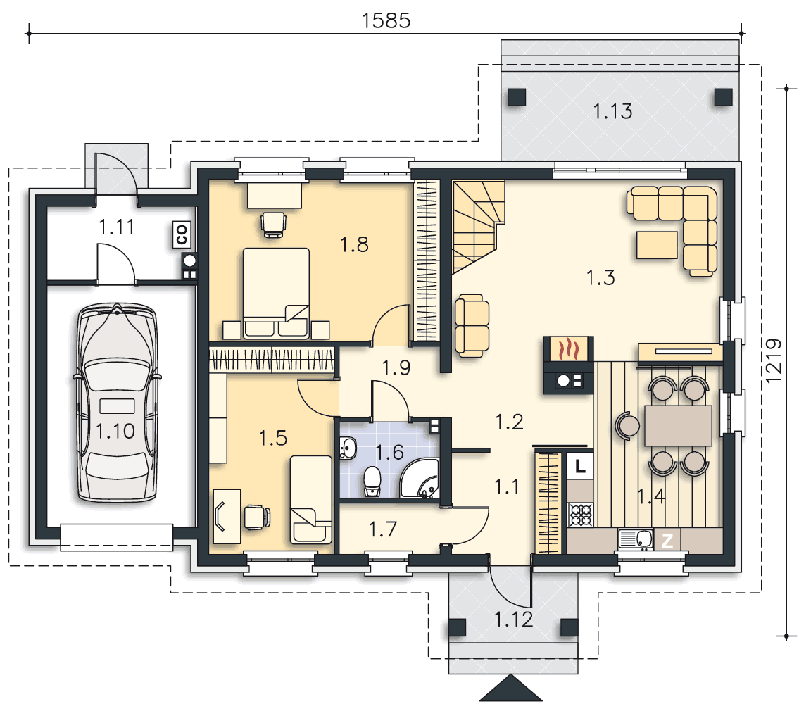 Nie za duży dom o prostej bryle, dający duże możliwości do zmian wewnątrz. Dobre rozmieszczenie pomieszczeń. Prosta bryła a duża przestrzeń wewnątrz. Jest to dom, o którym marzyłam.