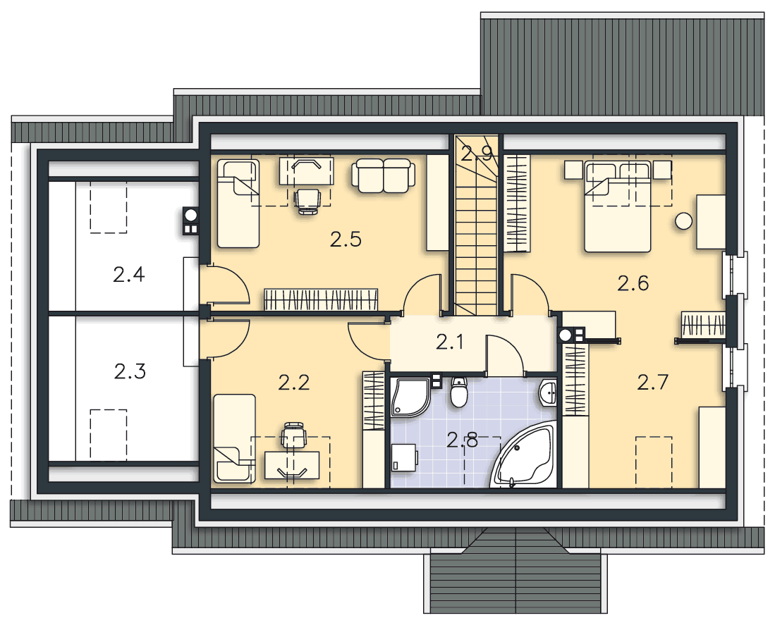 Malutką łazienkę dałoby się wygospodarować w pomieszczeniu 2.3, jeśli tylko będzie taka potrzeba. Zmianę taką może nanieść na projekt lokalny architekt w ramach adaptacji.