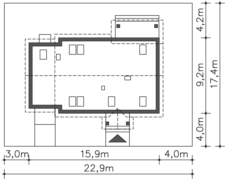 Grafika przedstawia minimalne wymiary działki. Aby sprawdzić, czy dom może być realizowany na konkretnej działce należy uzyskać Wypis i Wyrys z Miejscowego Planu Zagospodarowania Przestrzennego lub jeśli na danym terenie nie ma planu – Decyzję o warunkach zabudowy. Wszystkie projekty wymagają adaptacji do warunków miejscowych przez projektanta lokalnego.