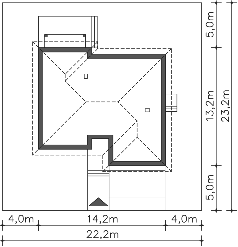 Grafika przedstawia minimalne wymiary działki. Aby sprawdzić, czy dom może być realizowany na konkretnej działce należy uzyskać Wypis i Wyrys z Miejscowego Planu Zagospodarowania Przestrzennego lub jeśli na danym terenie nie ma planu – Decyzję o warunkach zabudowy. Wszystkie projekty wymagają adaptacji do warunków miejscowych przez projektanta lokalnego.