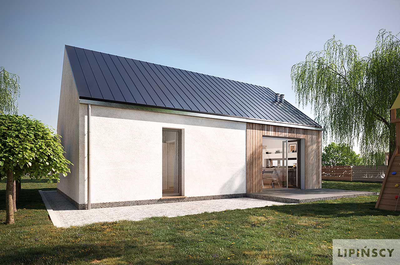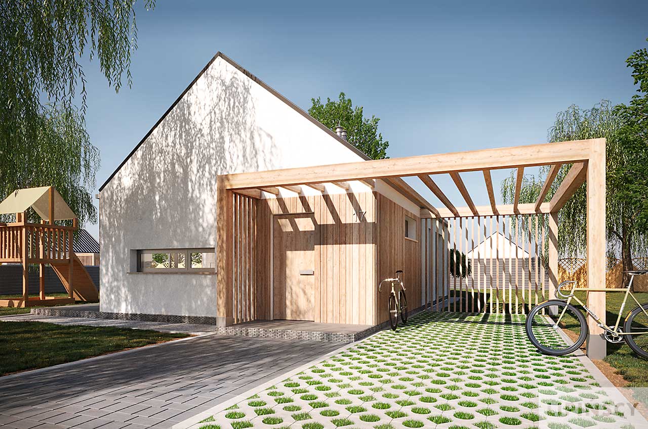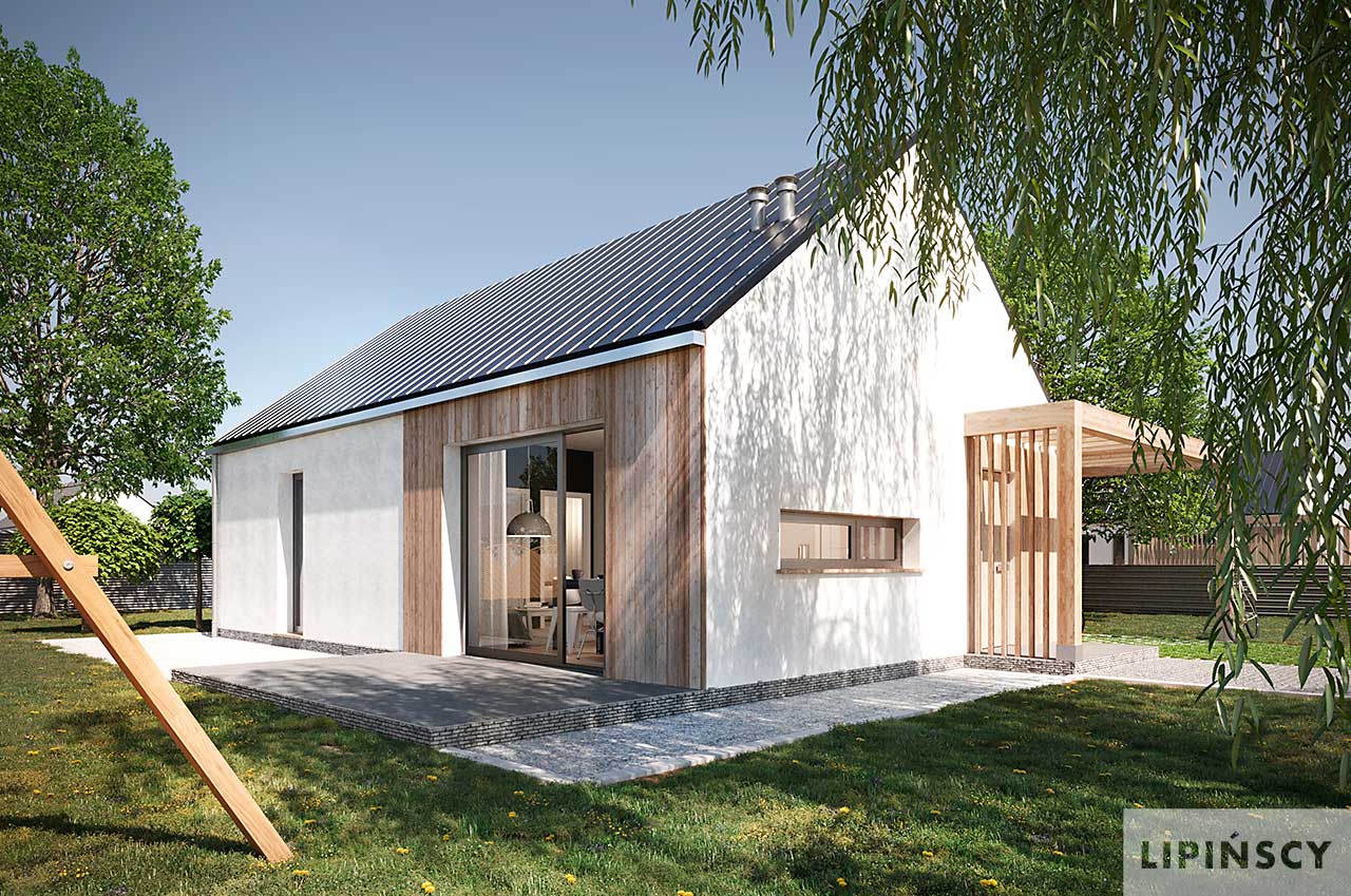 Projekt domu Castana to mały dom parterowy z drewnianą ozdobną wiatą, idealny do budowy na zgłoszenie. Dwuspadowy dach, plan prostokąta oraz powierzchnia zabudowy do 70 m kw. składają się na jego ekonomiczność. Jest świetną propozycją dla niewielkiej rodziny, pary lub singla. Otwarta przestrzeń dzienna z salonem i aneksem kuchennym, dwie sypialnie, łazienka oraz pomieszczenie gospodarcze z pompą ciepła to wygodne rozwiązanie, w którym dodatkowo do minimum ograniczono powierzchnię komunikacyjną. W projekcie przewidziano ogrzewanie pompą ciepła.