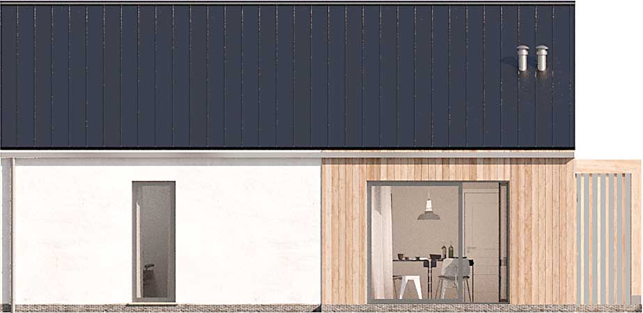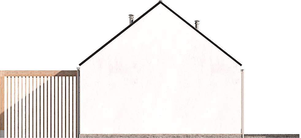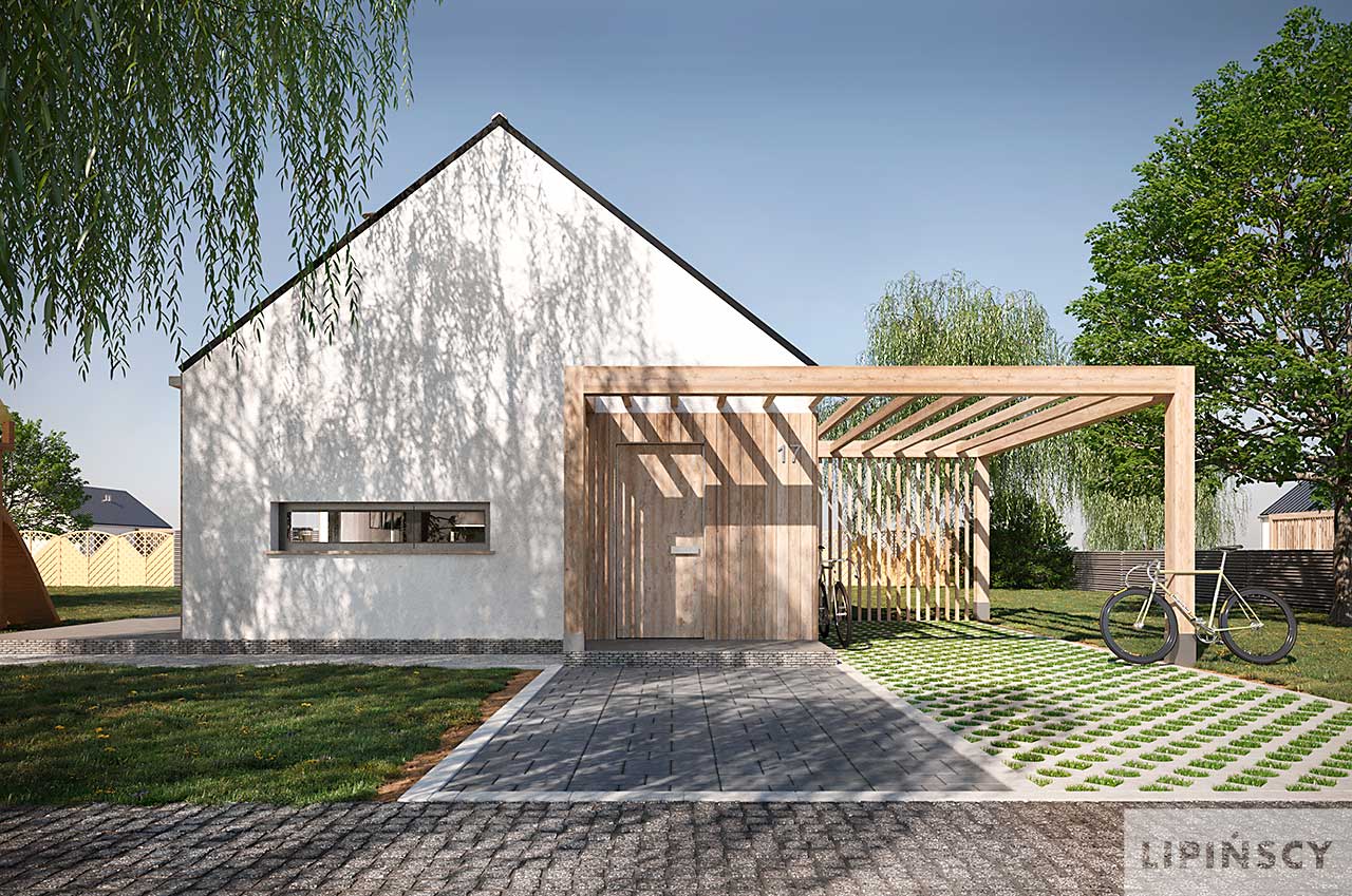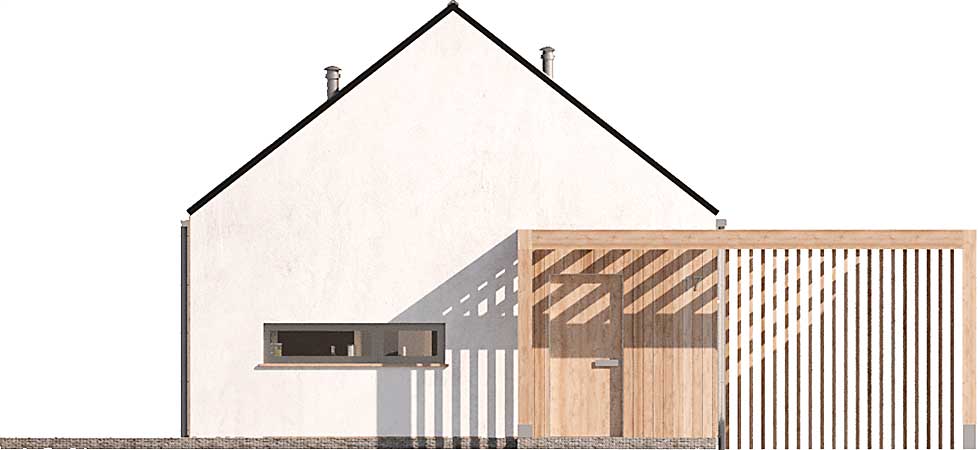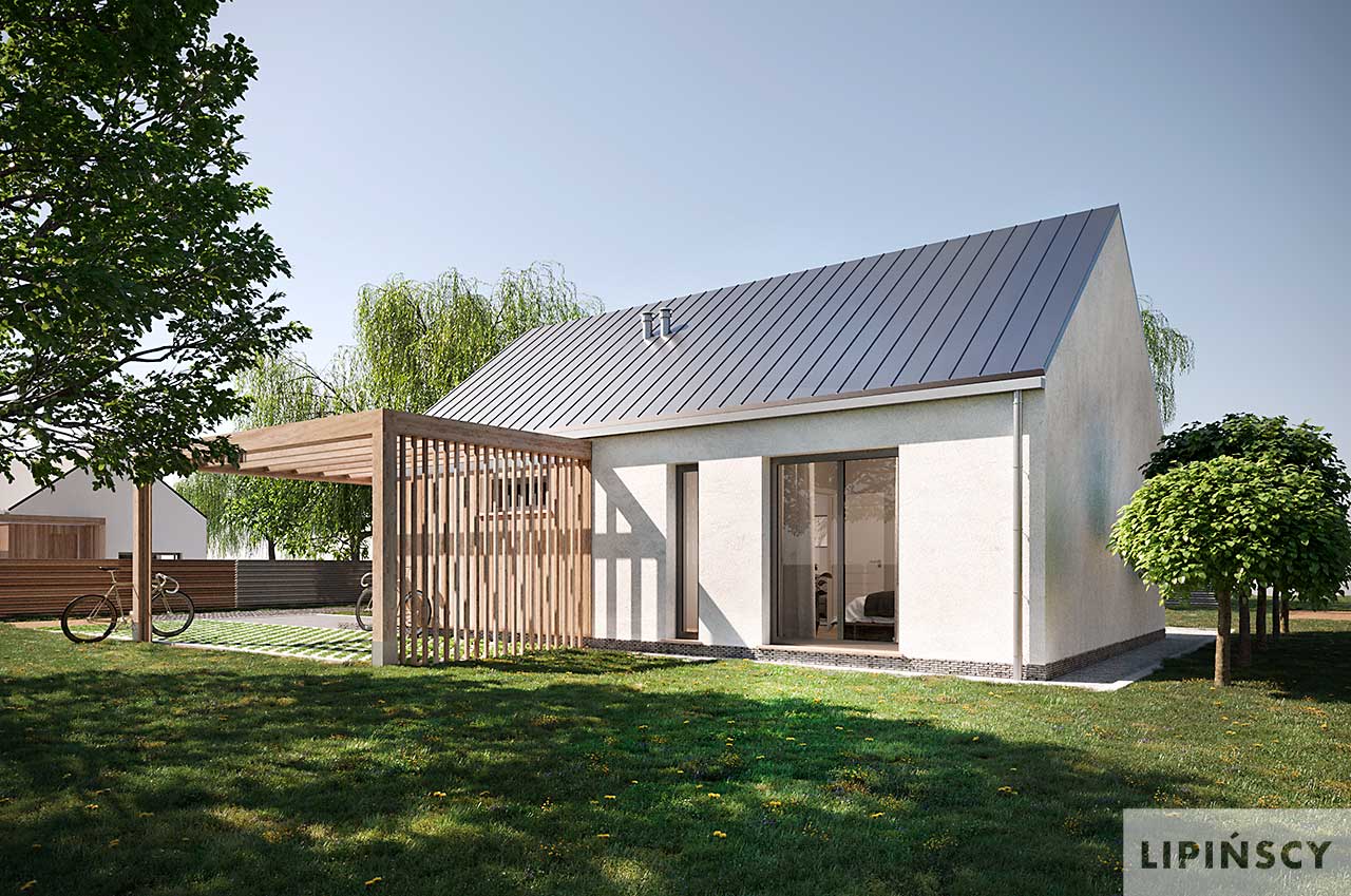 Projekt domu Castana to mały dom parterowy z drewnianą ozdobną wiatą, idealny do budowy na zgłoszenie. Dwuspadowy dach, plan prostokąta oraz powierzchnia zabudowy do 70 m kw. składają się na jego ekonomiczność. Jest świetną propozycją dla niewielkiej rodziny, pary lub singla. Otwarta przestrzeń dzienna z salonem i aneksem kuchennym, dwie sypialnie, łazienka oraz pomieszczenie gospodarcze z pompą ciepła to wygodne rozwiązanie, w którym dodatkowo do minimum ograniczono powierzchnię komunikacyjną. W projekcie przewidziano ogrzewanie pompą ciepła.