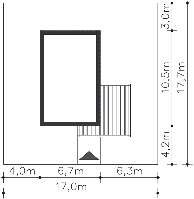 Grafika przedstawia minimalne wymiary działki. Aby sprawdzić, czy dom może być realizowany na konkretnej działce należy uzyskać Wypis i Wyrys z Miejscowego Planu Zagospodarowania Przestrzennego lub jeśli na danym terenie nie ma planu – Decyzję o warunkach zabudowy. Wszystkie projekty wymagają adaptacji do warunków miejscowych przez projektanta lokalnego.