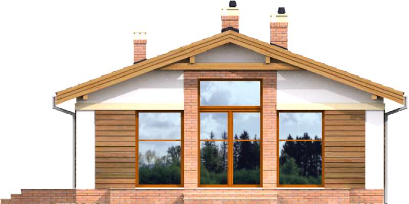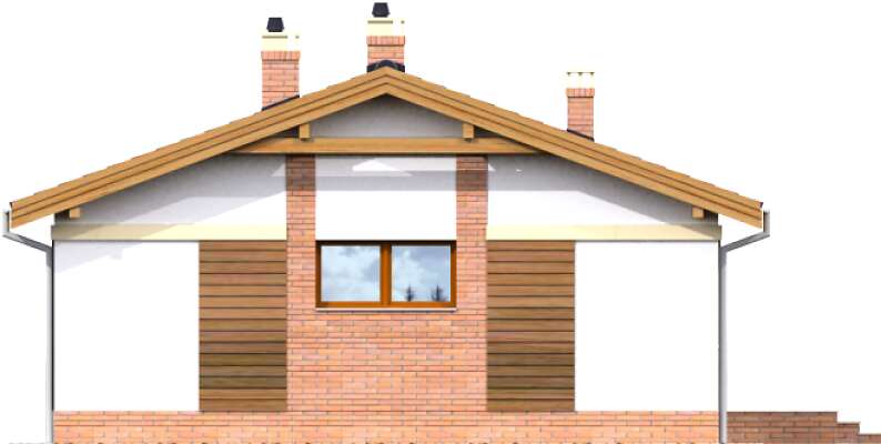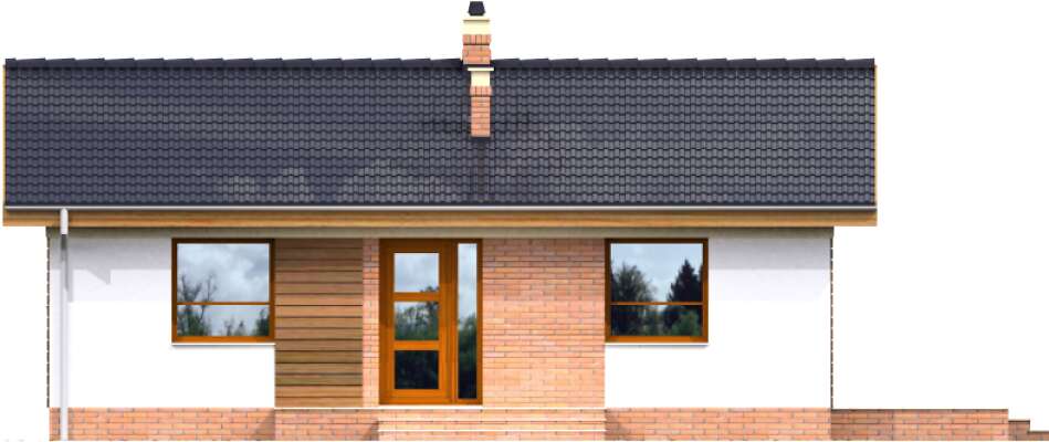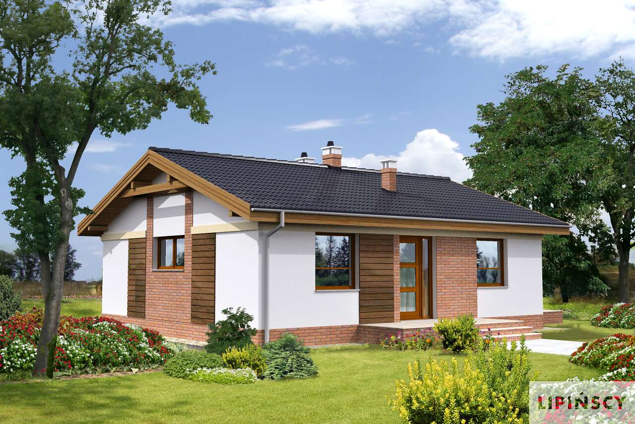 Niewielki dom parterowy, doskonały dla seniorów, którzy mają do dyspozycji funkcjonalny parter, podzielony na doświetlony salon z kominkiem i aneksem kuchennym i miejscem na stół, dwie sypialnie, łazienkę i pomieszczenie gospodarcze z kotłem gazowym. Niewielkie rozmiary domu czynią go zarówno tanim w budowie, jak i ekonomicznym w późniejszej eksploatacji. Ładna, proporcjonalna bryła, przekryta prostym, dwuspadowym dachem, pięknie wpisze się w każdy krajobraz.