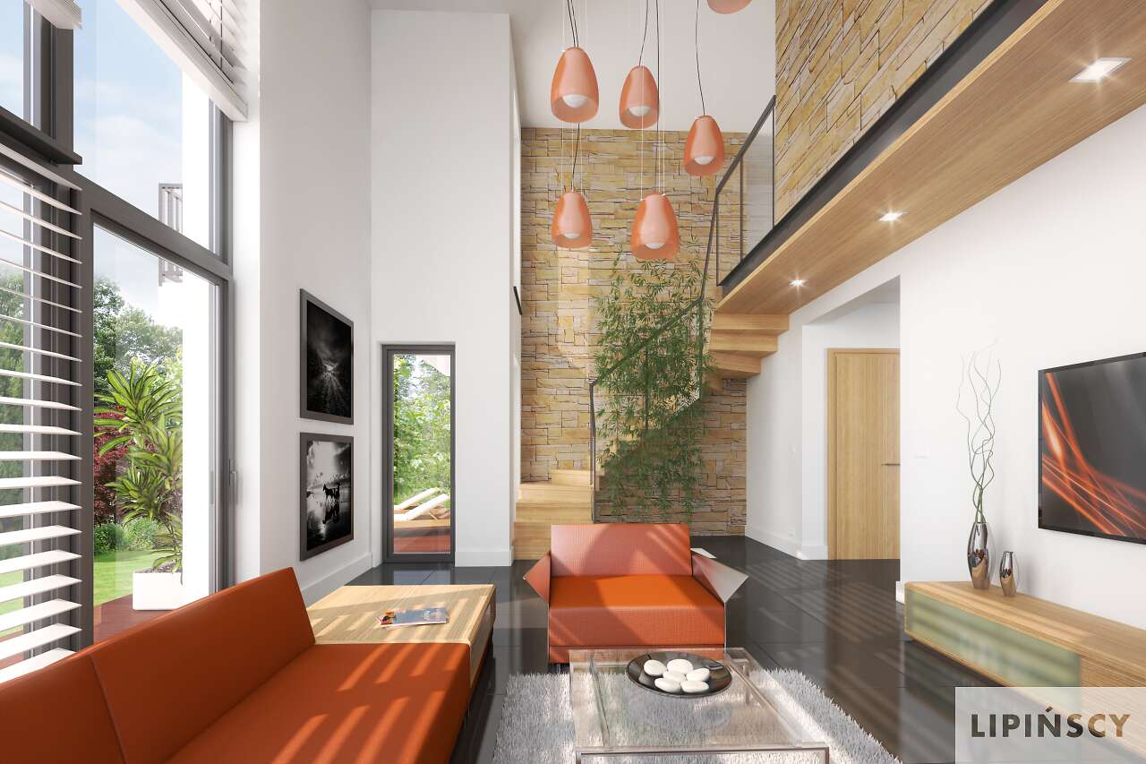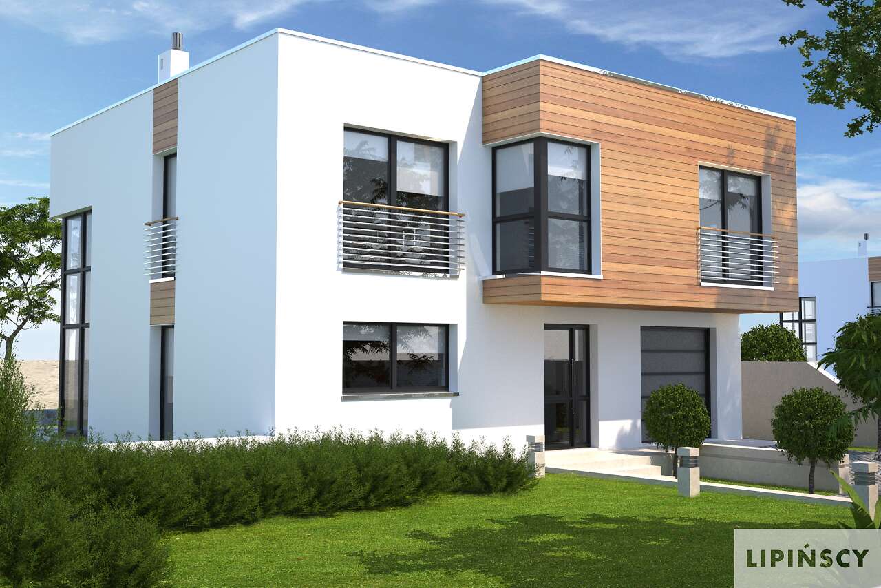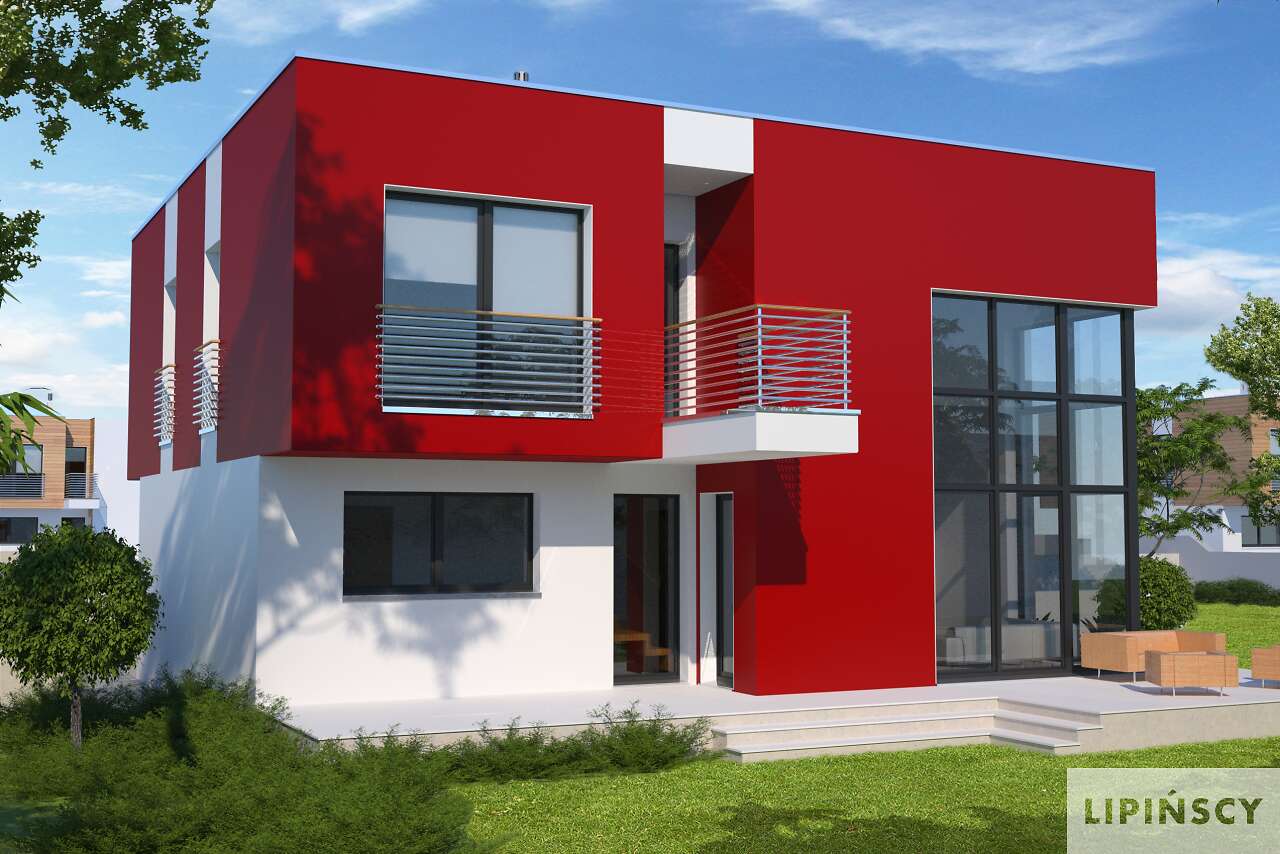 Nowoczesny, elegancki dom energooszczędny, którego bryła, dzięki zastosowaniu mocnych akcentów kolorystycznych i nowoczesnych przeszkleń, jest wyjątkowa i spodoba się miłośnikom niebanalnych rozwiązań. Dla Inwestorów, ceniących bardziej tradycyjne rozwiązania przygotowano wersję elewacji w stonowanych kolorach, z drewnianymi i metalowymi elementami. Na parterze znajduje się salon z antresolą, ustawna kuchnia z miejscem na rodzinny stół, spiżarnia i wc. Drugą kondygnację zajmują trzy sypialnie, w tym jedna z niezależną łazienką, i wspólna łazienka. Duże przeszklenia w salonie doskonale doświetlają wnętrze i są bardzo charakterystycznym elementem bryły.