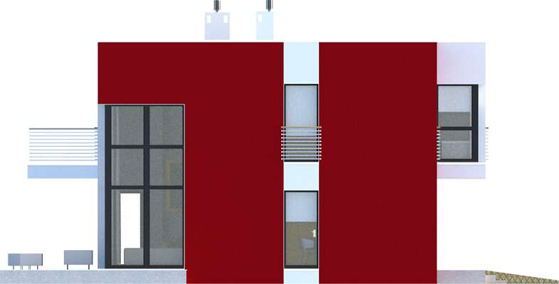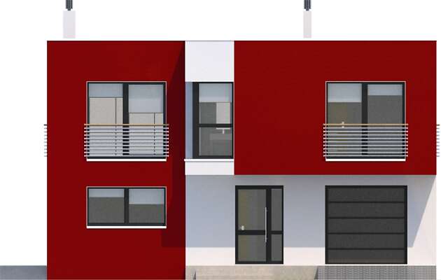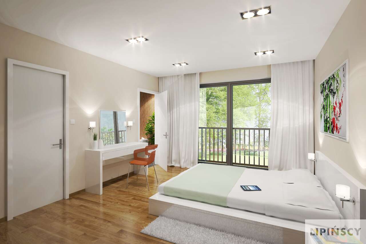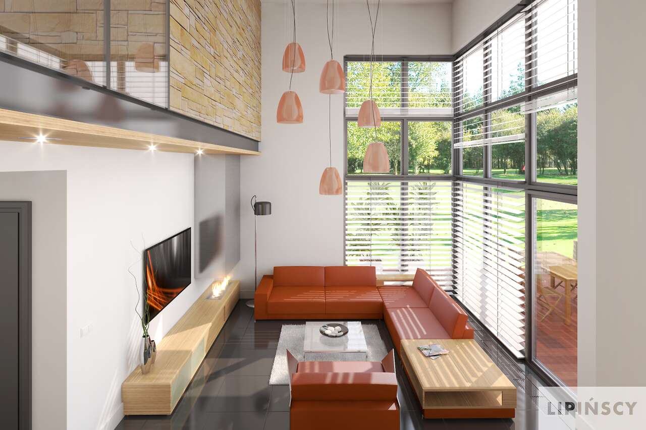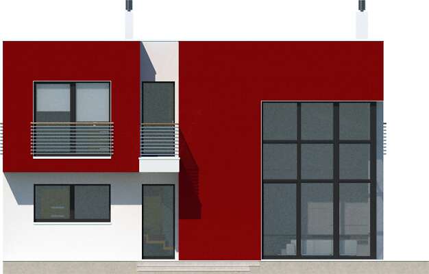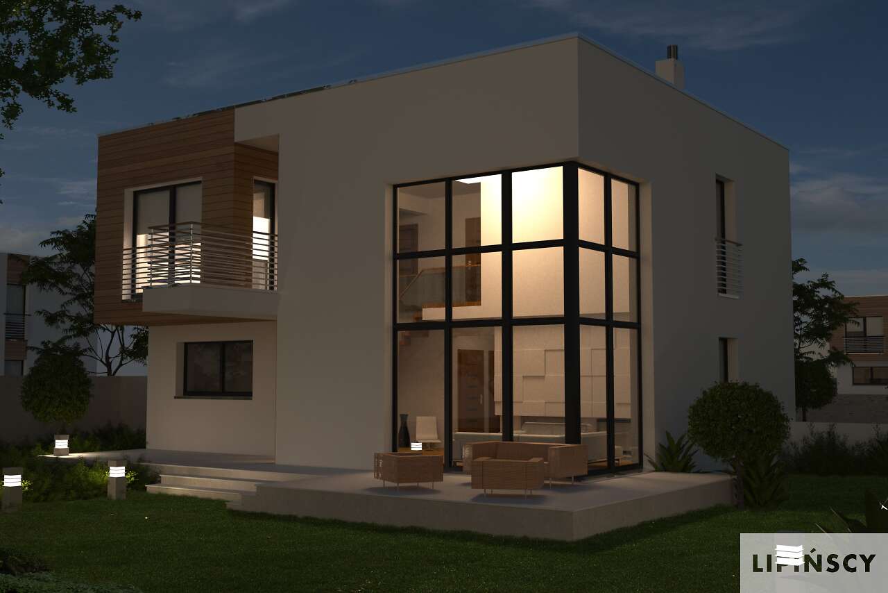 Nowoczesny, elegancki dom energooszczędny, którego bryła, dzięki zastosowaniu mocnych akcentów kolorystycznych i nowoczesnych przeszkleń, jest wyjątkowa i spodoba się miłośnikom niebanalnych rozwiązań. Dla Inwestorów, ceniących bardziej tradycyjne rozwiązania przygotowano wersję elewacji w stonowanych kolorach, z drewnianymi i metalowymi elementami. Na parterze znajduje się salon z antresolą, ustawna kuchnia z miejscem na rodzinny stół, spiżarnia i wc. Drugą kondygnację zajmują trzy sypialnie, w tym jedna z niezależną łazienką, i wspólna łazienka. Duże przeszklenia w salonie doskonale doświetlają wnętrze i są bardzo charakterystycznym elementem bryły.