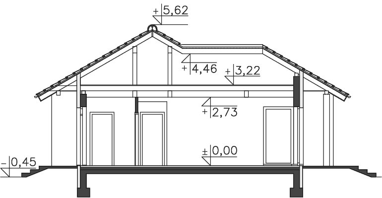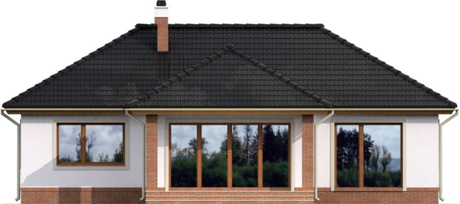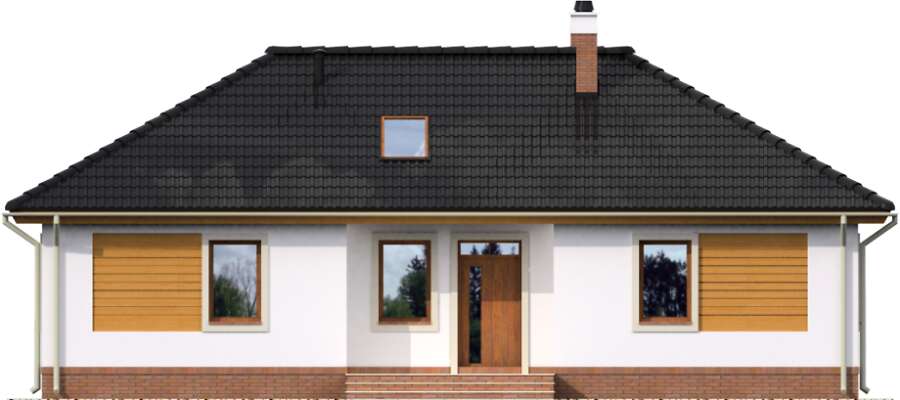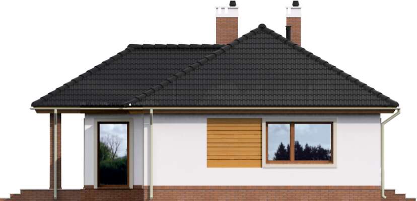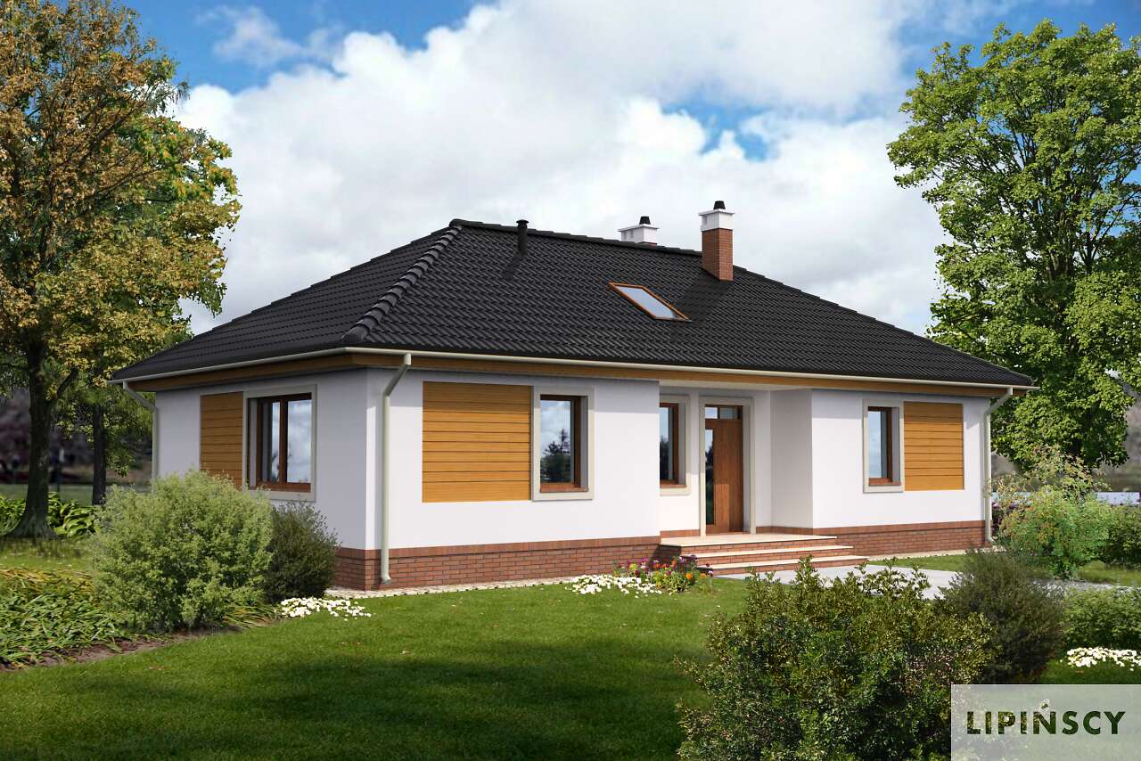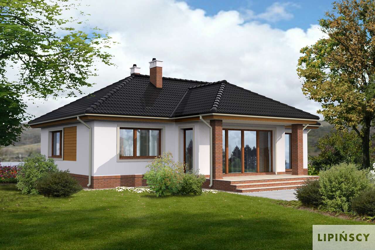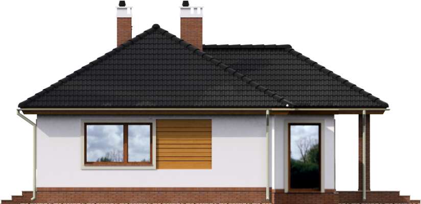 Ładny dom parterowy, wygodny dla niewielkiej rodziny. Funkcjonalnie rozplanowane wnętrze kryje wygodną, zamkniętą kuchnię, salon z kominkiem, trzy sypialnie, łazienkę i pomieszczenie gospodarcze, w którym zlokalizowano kocioł gazowy. W wiatrołapie przewidziano miejsce na wygodne szafy, które pomieszczą nie tylko wierzchnie okrycia. Może ono służyć także z powodzeniem jako pralnia. Duże przeszklone drzwi prowadzą z salonu na częściowo zadaszony taras. Prostą, elegancką bryłę zdobią drewniane elementy elewacji.