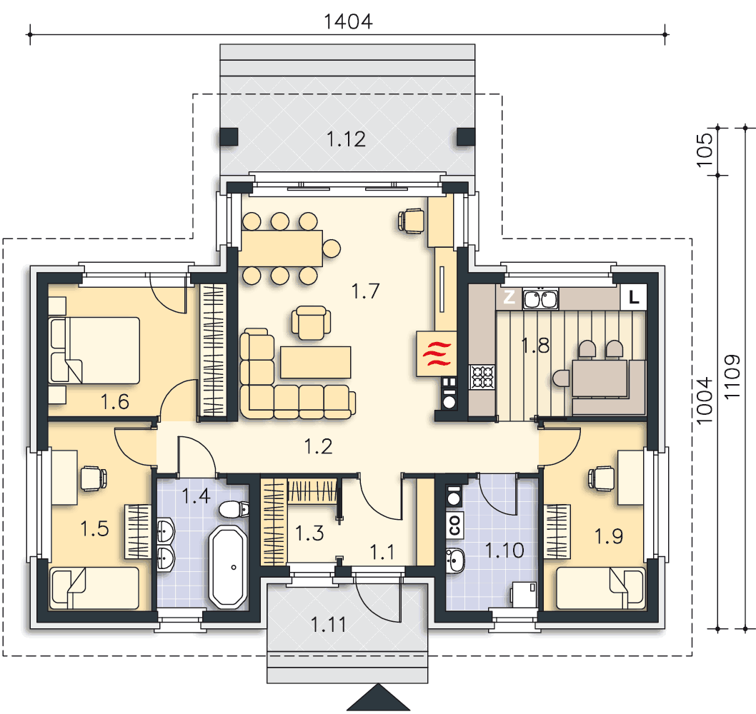 Możliwe jest powiększenie pomieszczenia 1.10 kosztem pokoju 1.9. Można również doprojektować garaż. W celu uzyskania wyceny zapraszamy do kontaktu bezpośrednio z biurem: biuro@lipinscy.pl