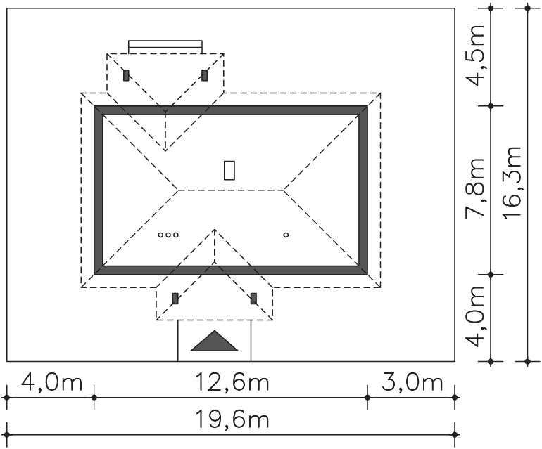 Grafika przedstawia minimalne wymiary działki. Aby sprawdzić, czy dom może być realizowany na konkretnej działce należy uzyskać Wypis i Wyrys z Miejscowego Planu Zagospodarowania Przestrzennego lub jeśli na danym terenie nie ma planu – Decyzję o warunkach zabudowy. Wszystkie projekty wymagają adaptacji do warunków miejscowych przez projektanta lokalnego.