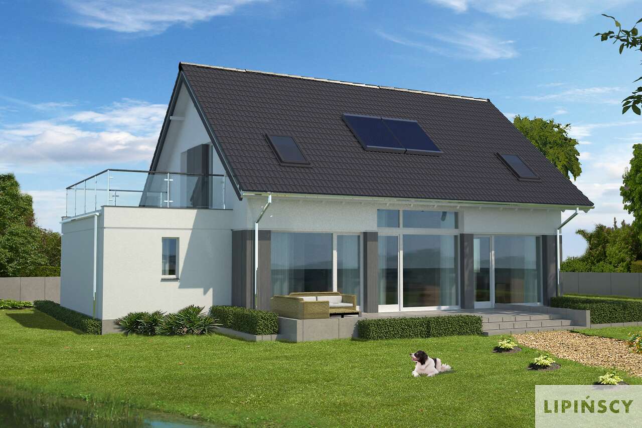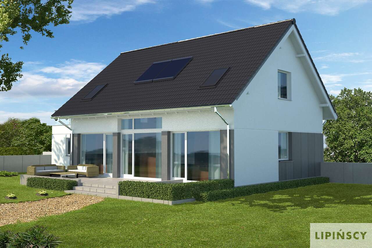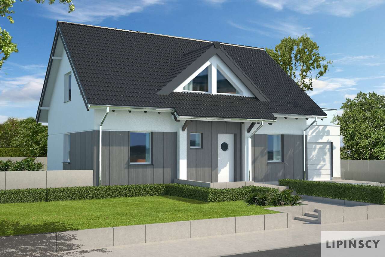 Spełnienie marzeń o rodzinnym, ciepłym domu. Prosta bryła o harmonijnych proporcjach, nawiązuje formą do archetypu domu. Poprzez zdecydowane dachy i przyjazny detal, doskonale wpisuje się w rodzimy krajobraz. Sercem jego jest przestronny pokój dzienny, z antresolą poddasza. Kuchnia jest wygodnie usytuowana, duża i jasna. Posiada użyteczne pomieszczenie gospodarcze i wydzielone miejsce na rodzinny stół. Gabinet może być z powodzeniem użytkowany jako pokój gościnny. Poddasze tworzy przestrzeń sypialni. Jest tu wygodny pokój rodziców wraz z garderobą, efektowna łazienka i królestwo dzieci: dwa ustawne pokoje, powiększane w lecie o taras nad garażem. Ten nowoczesny dom zaprojektowany w standardzie domu pasywnego jest wyposażony w kompaktowe urządzenie z pompą ciepła i rekuperacją oraz gruntowy wymiennik ciepła, przez co uzyskuje się bardzo przyjazny klimat domu (wskazany dla osób z alergią).