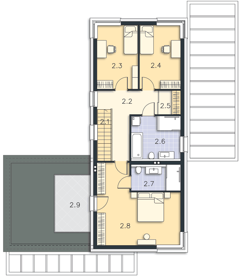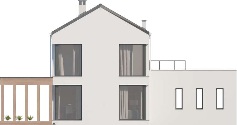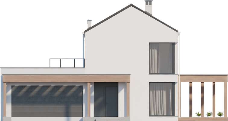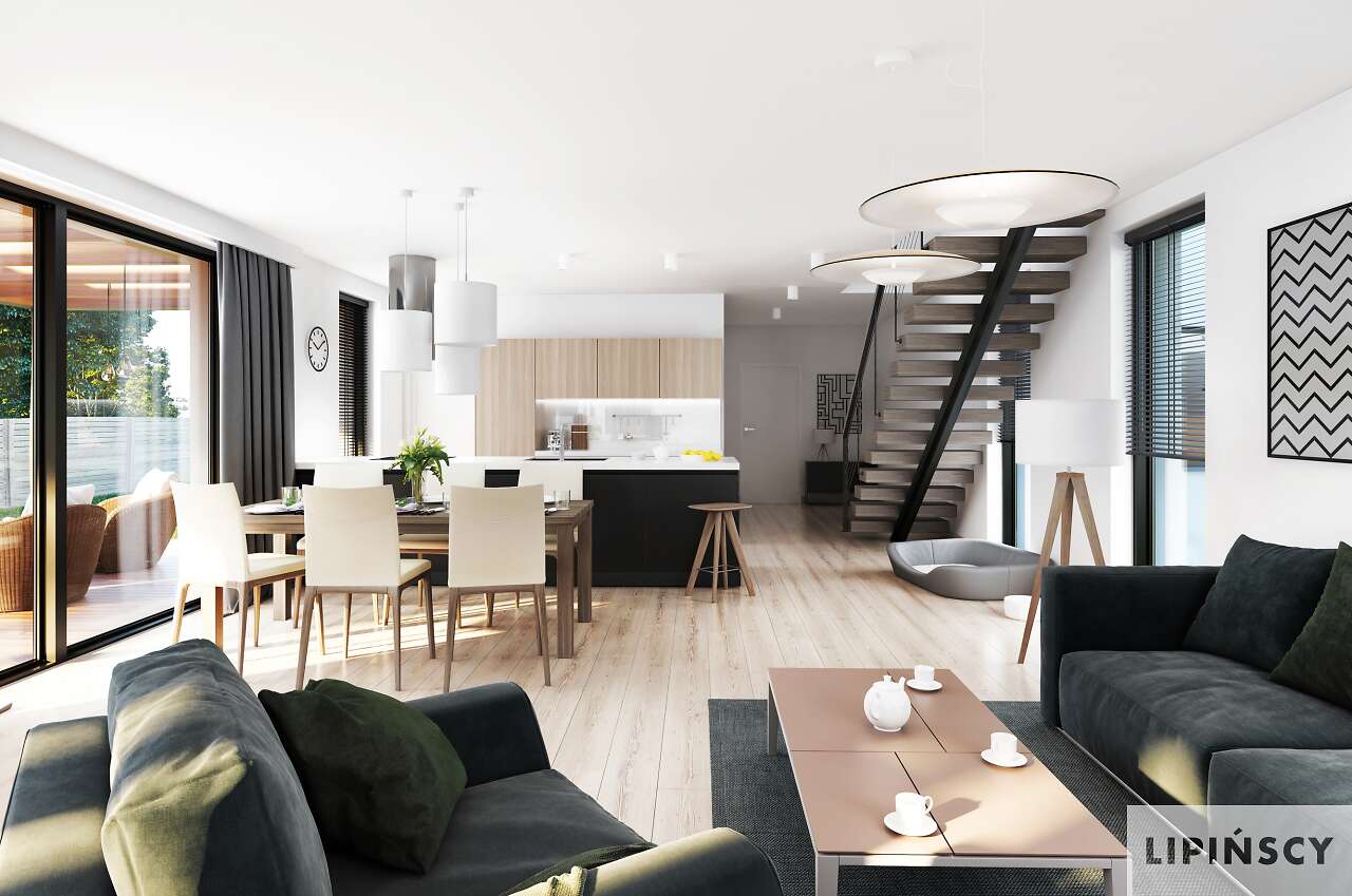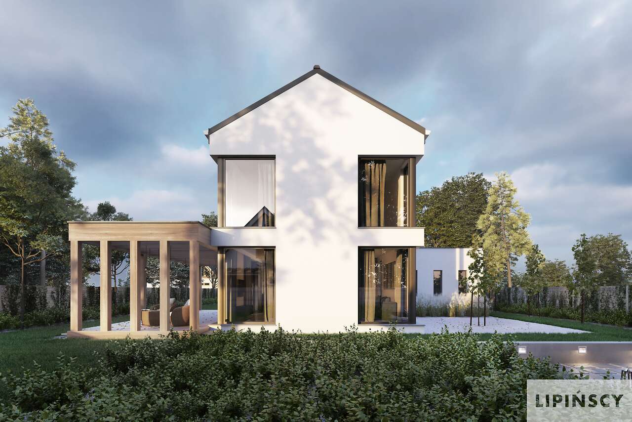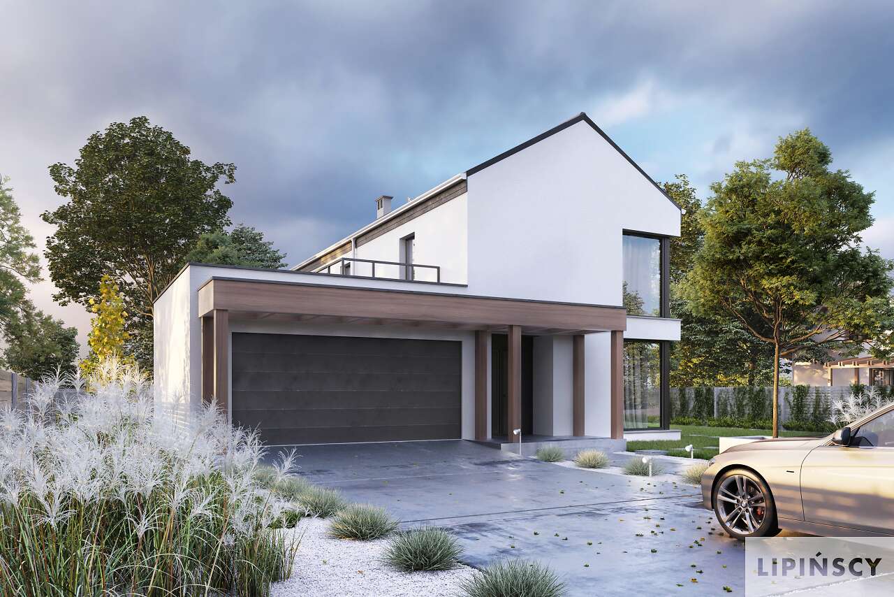 Dom energooszczędny, o nowoczesnej bryle w kształcie litery L, z pięknym tarasem zacienionym pergolą i funkcjonalnie rozplanowaną przestrzenią użytkową, z wpisanym w bryłę dwustanowiskowym garażem. Układ budynku pozwala ciekawie zaaranżować przydomowy ogród. Centrum domu stanowi przestronny salon z jadalnią i kuchnią z wyspą, zlokalizowany na parterze. Jest tu także gabinet, niewielka łazienka i przydatna spiżarnia. Druga kondygnacja została przeznaczona na strefę dzienną, w której znajdują się dwa pokoje dziecięce, garderoba, łazienka oraz osobna sypialnia rodziców z niezależną łazienką, z której można wyjść na przestronny taras nad garażem.