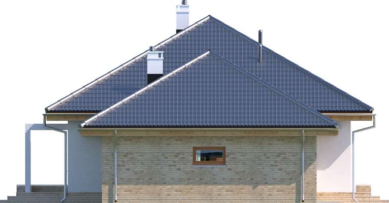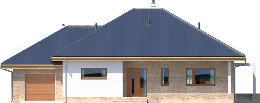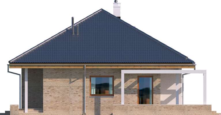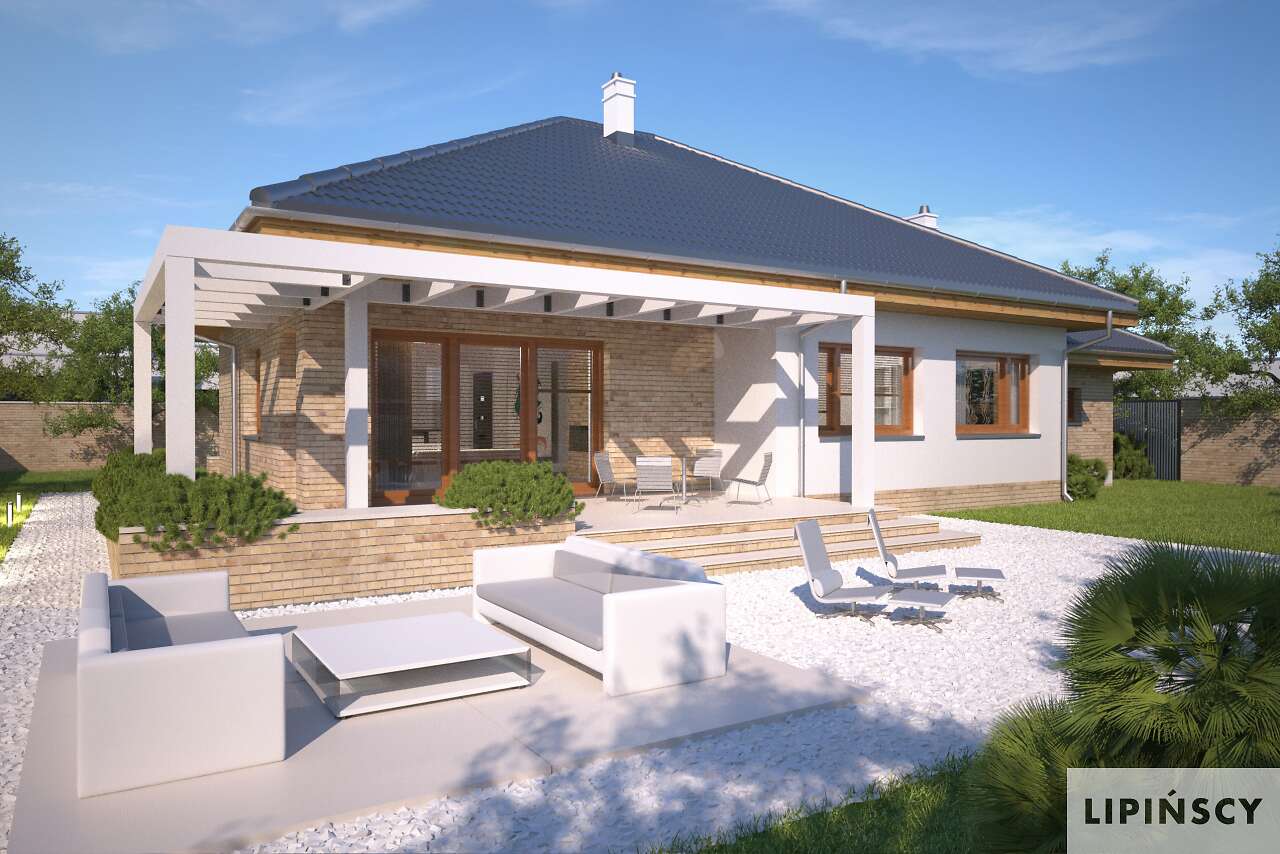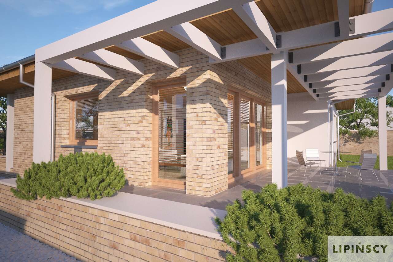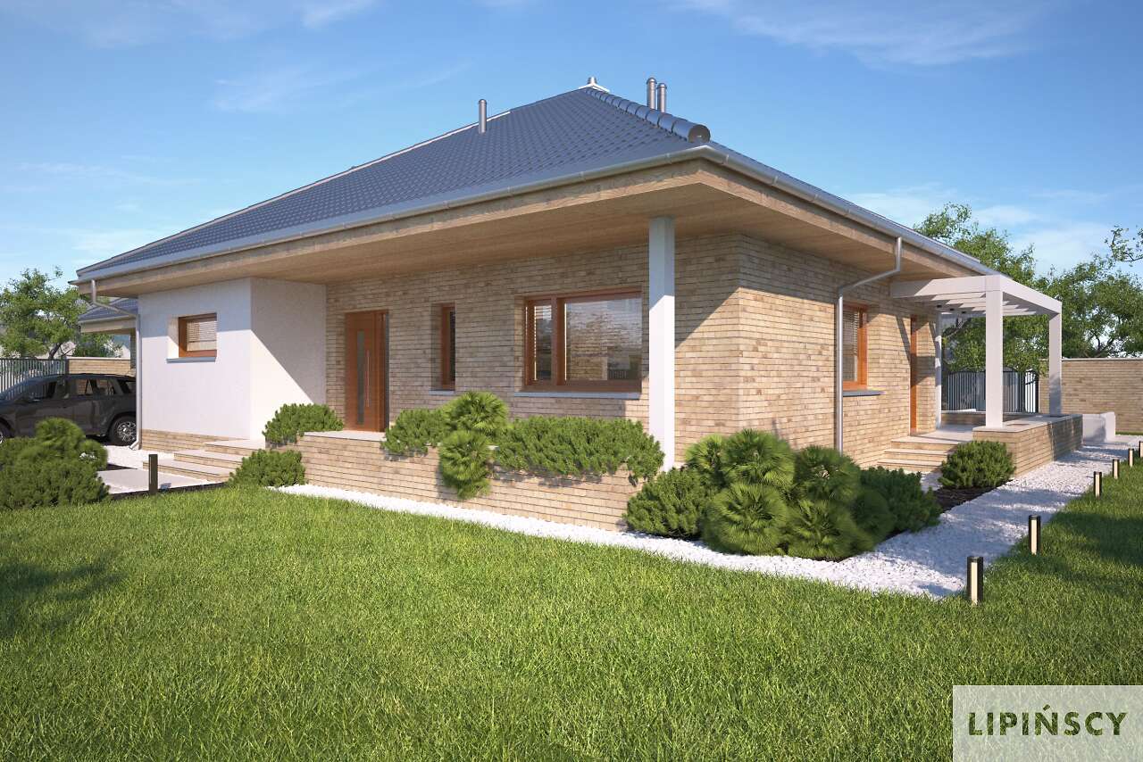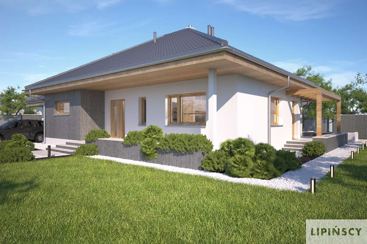 Prosty, elegancki i niewielki dom parterowy, z garażem. W projekcie przewidziano dwie ustawne sypialnie oraz obszerny salon połączony z kuchnią, w której zmieści się funkcjonalna wyspa oraz stół, doskonały do rodzinnego spożywania posiłków. Z salonu można wyjść na częściowo zadaszony taras, który dzięki dużym oknom, wydaje się niemal na wyciągnięcie ręki. Dużym atutem tego wygodnego domu jest duża, doświetlona naturalnym światłem łazienka, którą – dzięki sporym rozmiarom – można bardzo ciekawie zaaranżować.