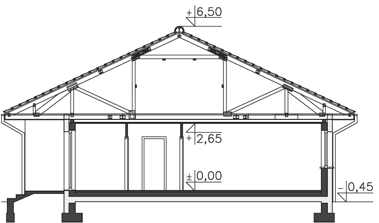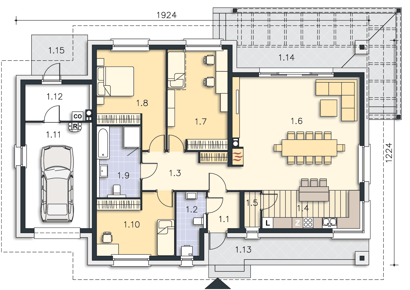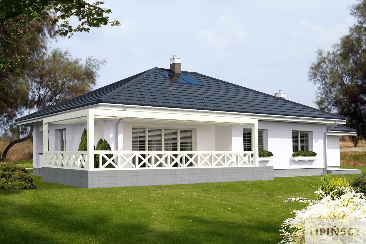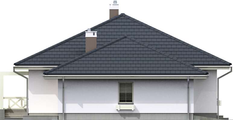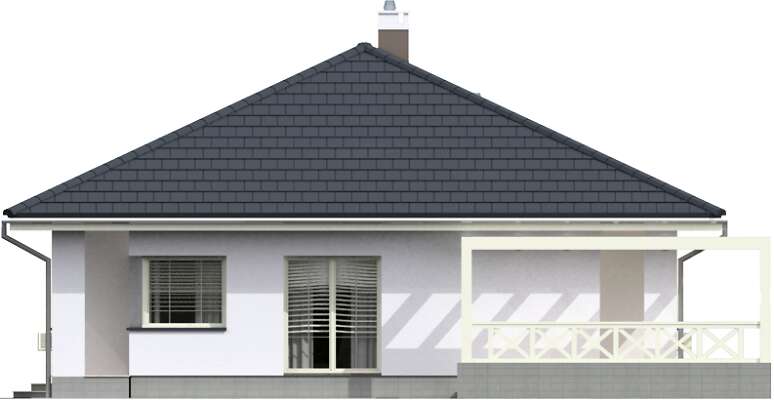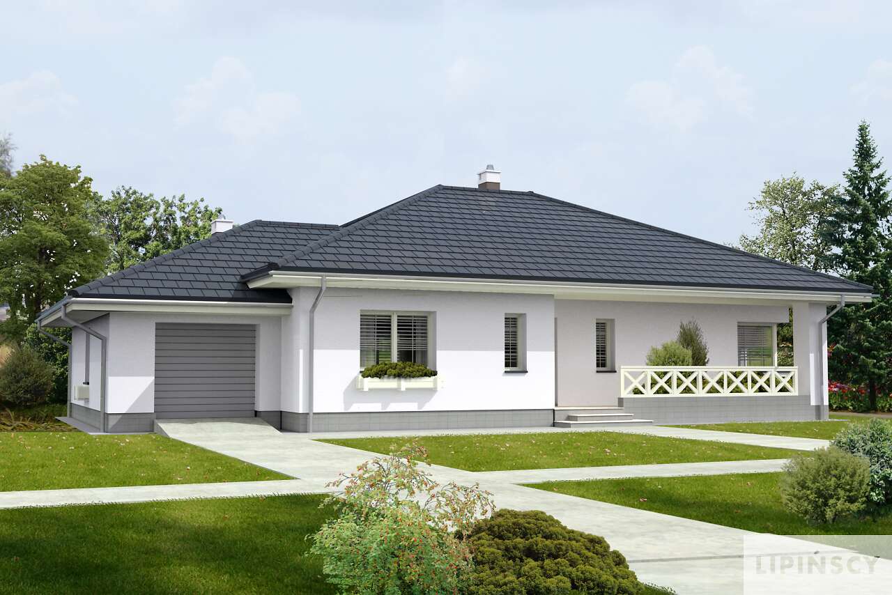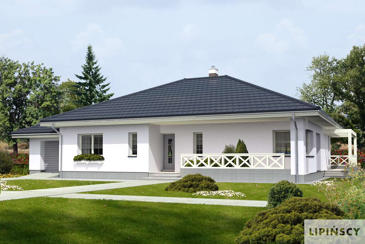 Energooszczędny dom parterowy, który zwraca uwagę głównie pięknym, jasnym i przestronnym salonem, z jadalnią i otwartą na niego kuchnią. Obok kuchni zlokalizowano podręczną spiżarnię. Obok korytarza zaplanowano niewielką łazienkę, co jest dobrym rozwiązaniem dla mieszkańców, którym zależy na wyraźnym oddzieleniu strefy ogólnodostępnej od prywatnej. W tej drugiej mieszczą się trzy pokoje – dwie sypialnie i gabinet oraz wygodna, przeznaczona dla domowników łazienka. Za garażem na jedno auto zaplanowano pomieszczenie gospodarcze z kotłownią i niezależnym wyjściem na zewnątrz, co jest bardzo wygodnym i praktycznym rozwiązaniem. Elewację domu – w zależności od gustu, można zrobić w stylu tradycyjnym, bądź nadać jej nowoczesnego charakteru. W projekcie przewidziano ogrzewanie kotłem na gaz. Możliwa jest zmiana ogrzewania na pompę ciepła.