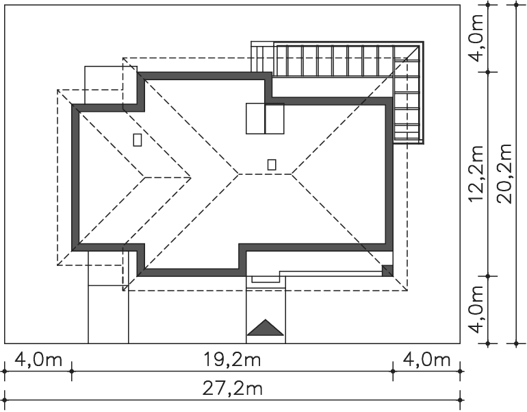 Grafika przedstawia minimalne wymiary działki. Aby sprawdzić, czy dom może być realizowany na konkretnej działce należy uzyskać Wypis i Wyrys z Miejscowego Planu Zagospodarowania Przestrzennego lub jeśli na danym terenie nie ma planu – Decyzję o warunkach zabudowy. Wszystkie projekty wymagają adaptacji do warunków miejscowych przez projektanta lokalnego.