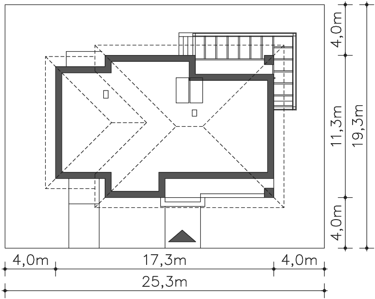 Grafika przedstawia minimalne wymiary działki. Aby sprawdzić, czy dom może być realizowany na konkretnej działce należy uzyskać Wypis i Wyrys z Miejscowego Planu Zagospodarowania Przestrzennego lub jeśli na danym terenie nie ma planu – Decyzję o warunkach zabudowy. Wszystkie projekty wymagają adaptacji do warunków miejscowych przez projektanta lokalnego.