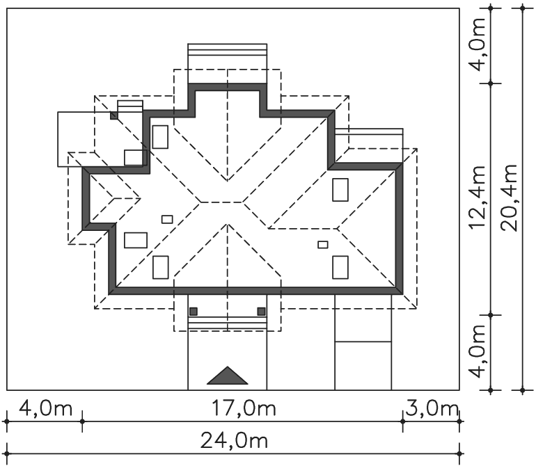Grafika przedstawia minimalne wymiary działki. Aby sprawdzić, czy dom może być realizowany na konkretnej działce należy uzyskać Wypis i Wyrys z Miejscowego Planu Zagospodarowania Przestrzennego lub jeśli na danym terenie nie ma planu – Decyzję o warunkach zabudowy. Wszystkie projekty wymagają adaptacji do warunków miejscowych przez projektanta lokalnego.