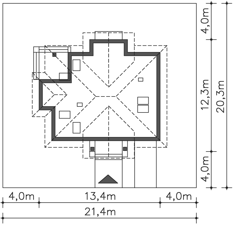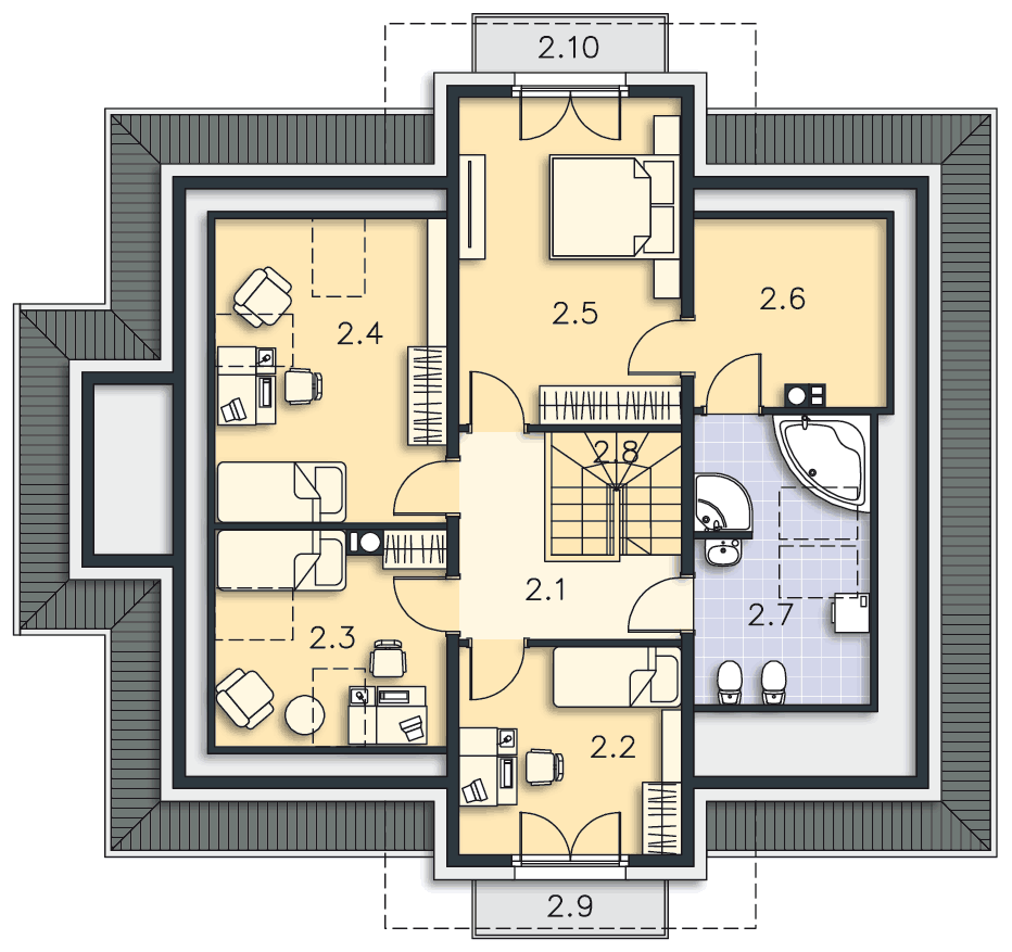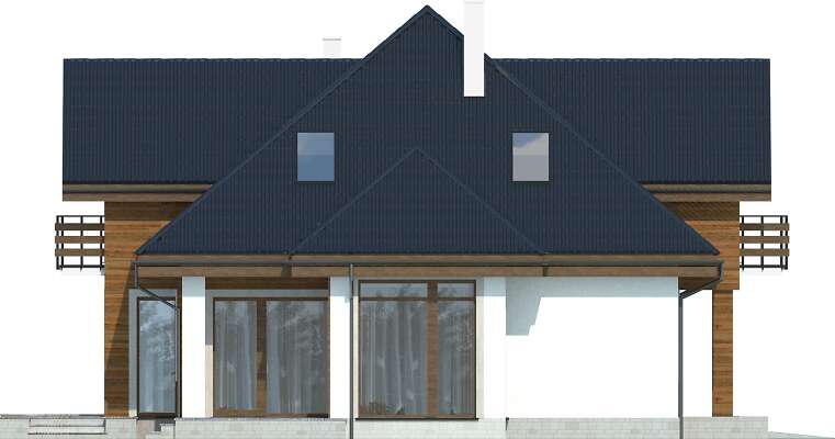 SkomentujSkosy w domu z dachem wielospadowym są nieuniknione. Dlatego w tym projekcie dodaliśmy wykusze, aby dwie sypialnie na poddaszu praktycznie tych skosów nie miały :-)