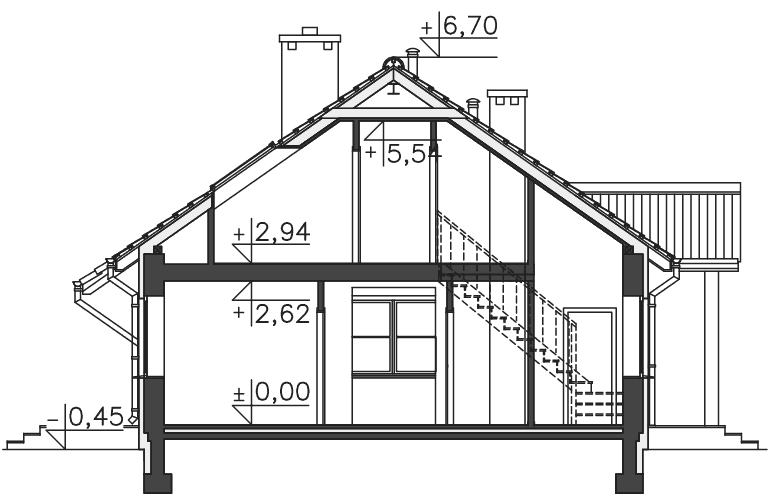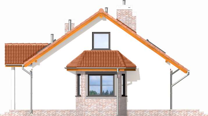 Mimo niewielkich gabarytów uzyskano stosunkowo dużą powierzchnię użytkową, wygodne duże sypialnie na dole. Schody przy wiatrołapie szczególnie ułatwią budowę etapami. Korzystne usytuowanie kominka. Wykusz z miejscem na stół. Prosty w budowie dwuspadowy dach.