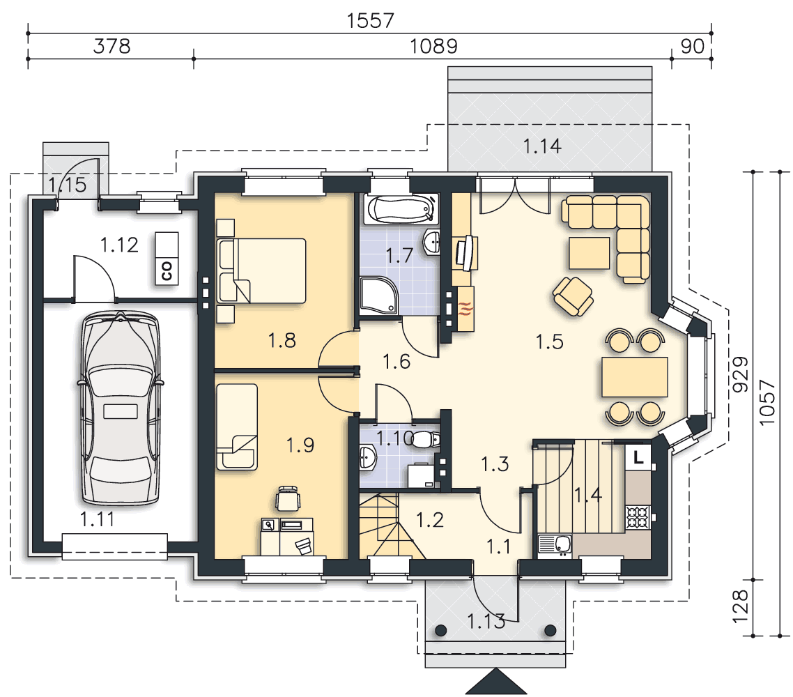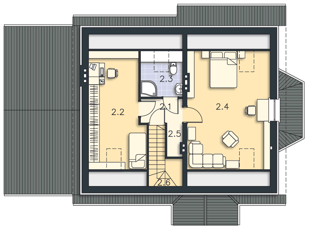 Dom Drezno idealnie nadaje się do budowy dwuetapowej. Na początek można zrealizować parter, gdzie znajdują się dwie sypialnie idealne na start. Poddasze może być wykończone później i dostępne przez schody umieszczone przy wiatrołapie. Na poddaszu znajdują się także dwie sypialnie i łazienka. Tak usytuowane poddasze może także nadawać się na wynajem, lub jako osobne mieszkanie dla dorastających dzieci. Kotłownia została umieszczona za garażem, co pozwala na uwolnienie części mieszkalnej z mniej estetycznego pomieszczenia. Nad garażem jest także dostępny stryszek na rzeczy rzadziej używane. Tak dobrze rozwiązany układ funkcjonalny małego domu, to bardzo duży atut. Dodatkowym atutem jest prosta, jednak bardzo elegancka bryła, co sprawia, że dom ten jest tani w budowie.