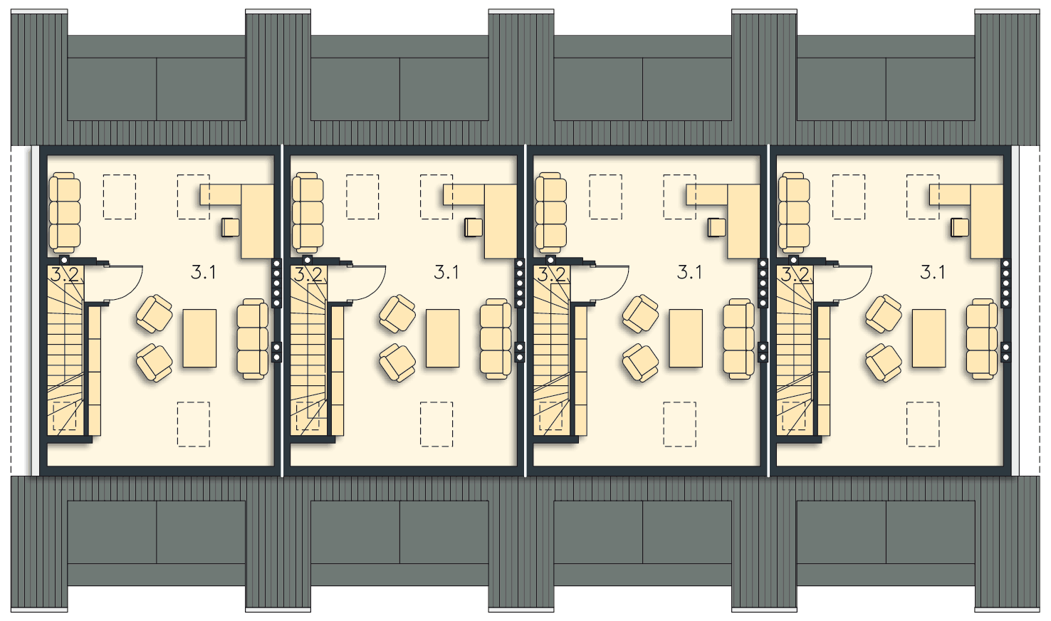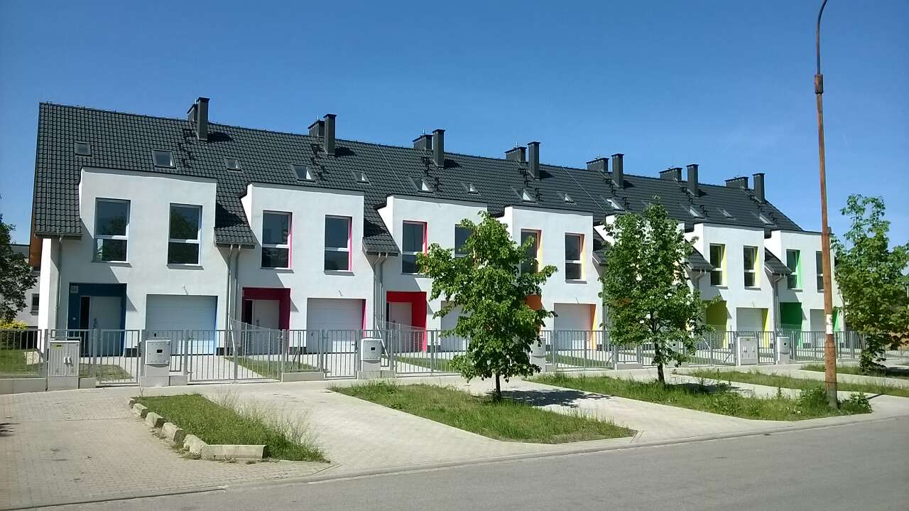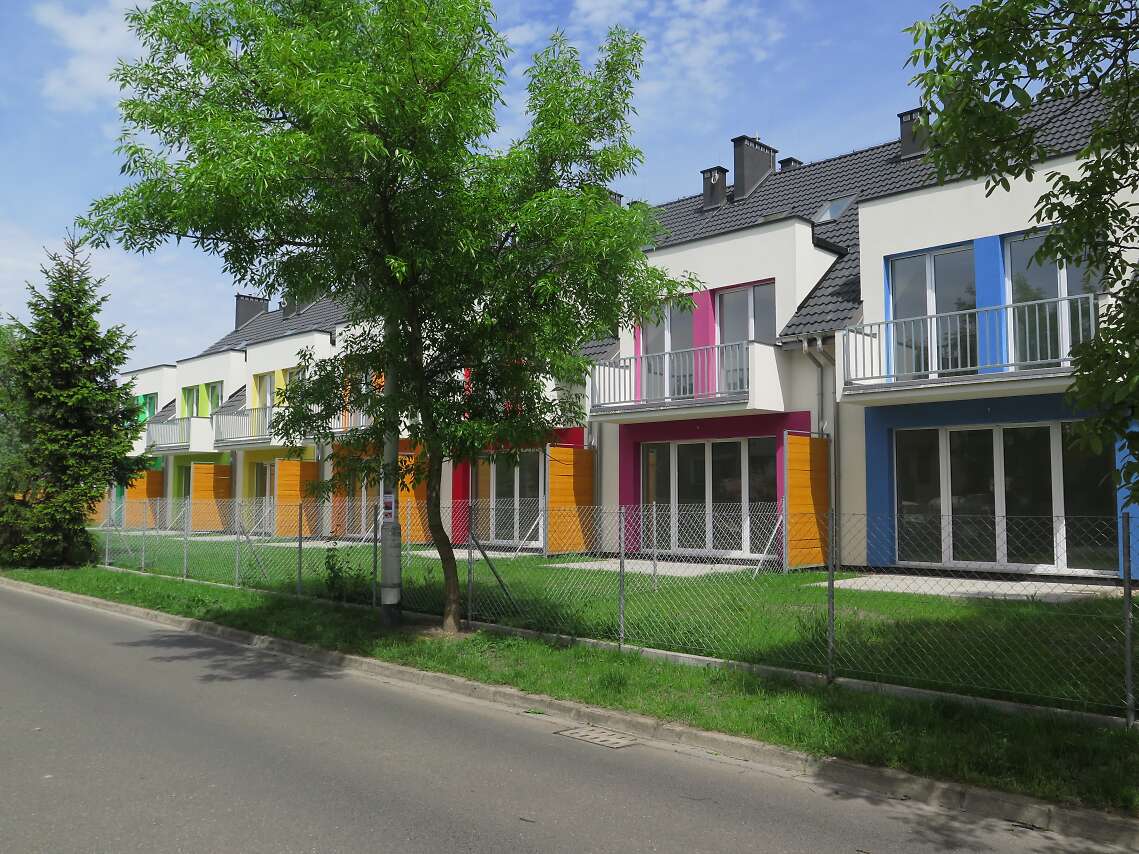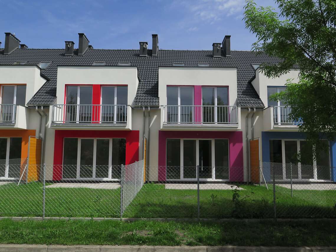 Projekt domu Edmonton z zabudowie szeregowej to prosty układ konstrukcyjny, znacznie ograniczający koszty budowy, a jednocześnie tworzący miły dla oka rytm lukarn. Lekką stylistykę podkreśla zastosowanie różnych kolorów do każdego domku, co nawiązuje do szeregowych osiedli Holandii, czy Belgii. Układ funkcjonalny to nowoczesne wnętrza, gdzie na parterze znajduje się część dzienna, sypialnie na poddaszu, a na najwyższej kondygnacji otwarte studio do zagospodarowania wedle potrzeby mieszkańców. Plusem jest także wbudowany garaż z przejściem do domu. Dostępna jest wersja z kominkiem.