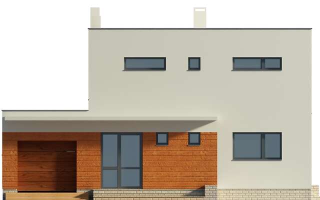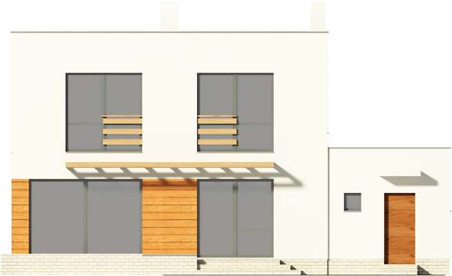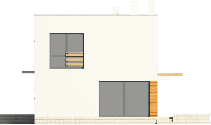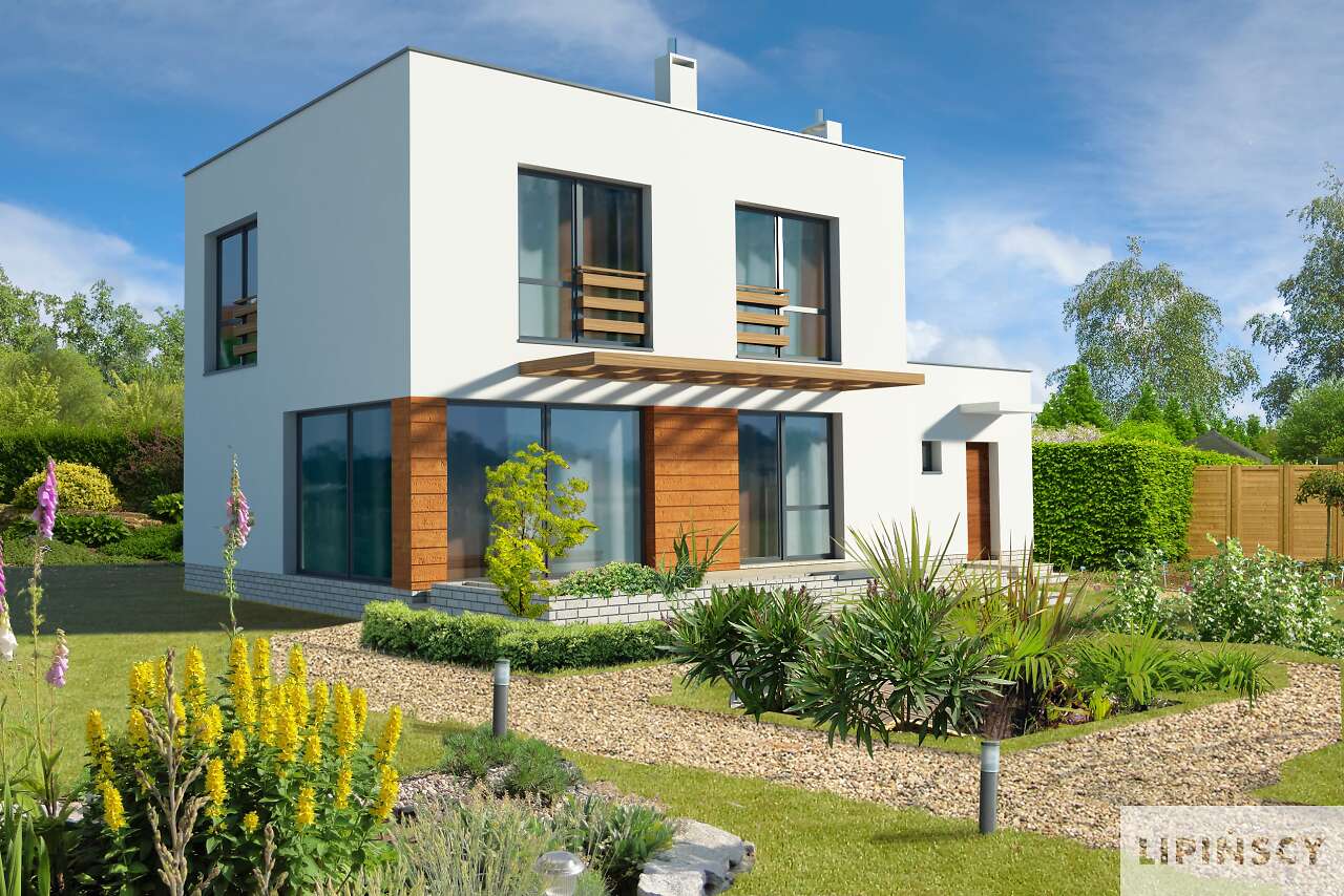 Nowoczesny dom energooszczędny, idealny dla niewielkiej rodziny. Prosta bryła kryje funkcjonalne wnętrze, podzielone na strefę wspólną na parterze oraz prywatną na piętrze. Do strefy wspólnej należy przeszklony salon, w którym znajdują się schody na drugą kondygnację, mogące być jego ozdobą, kuchnia, spiżarnia oraz wc. Drugie piętro zajmują trzy sypialnie, łazienka i pralnia. W bryłę domu wkomponowano garaż na jedno auto, a za nim zlokalizowano kotłownię, która dzięki niezależnemu wyjściu na zewnątrz może być zaadaptowana jako kotłownia na paliwo stałe.