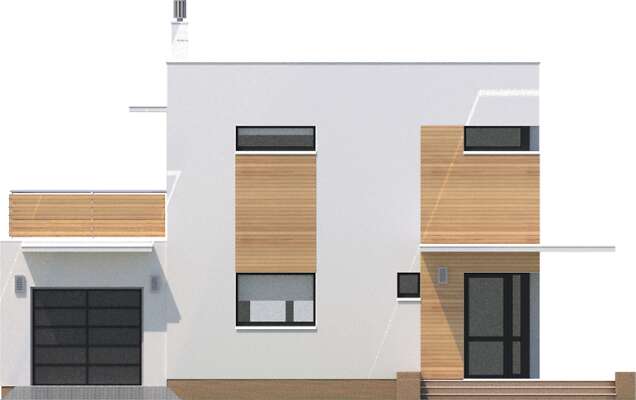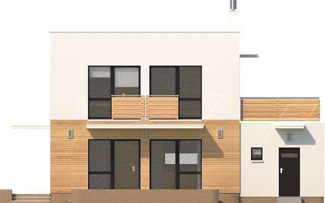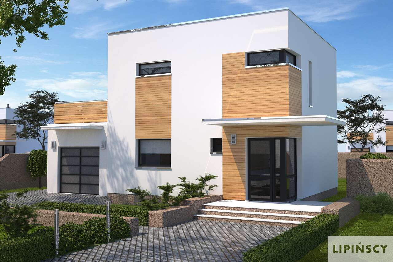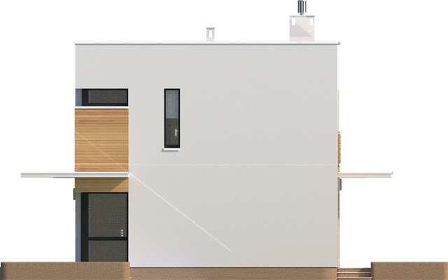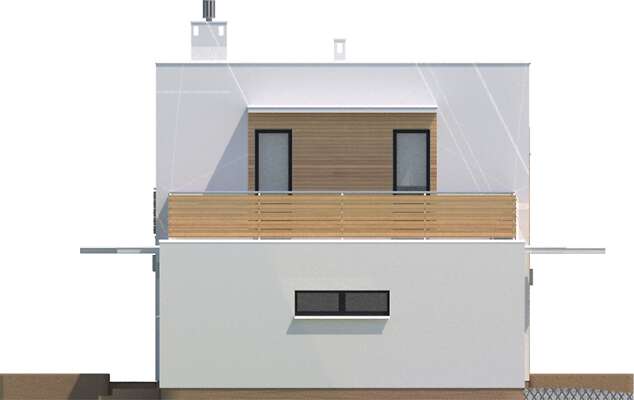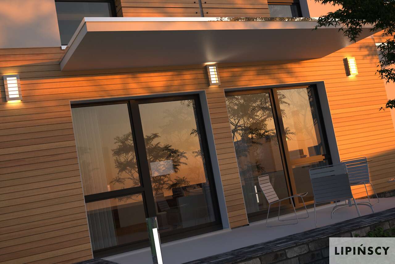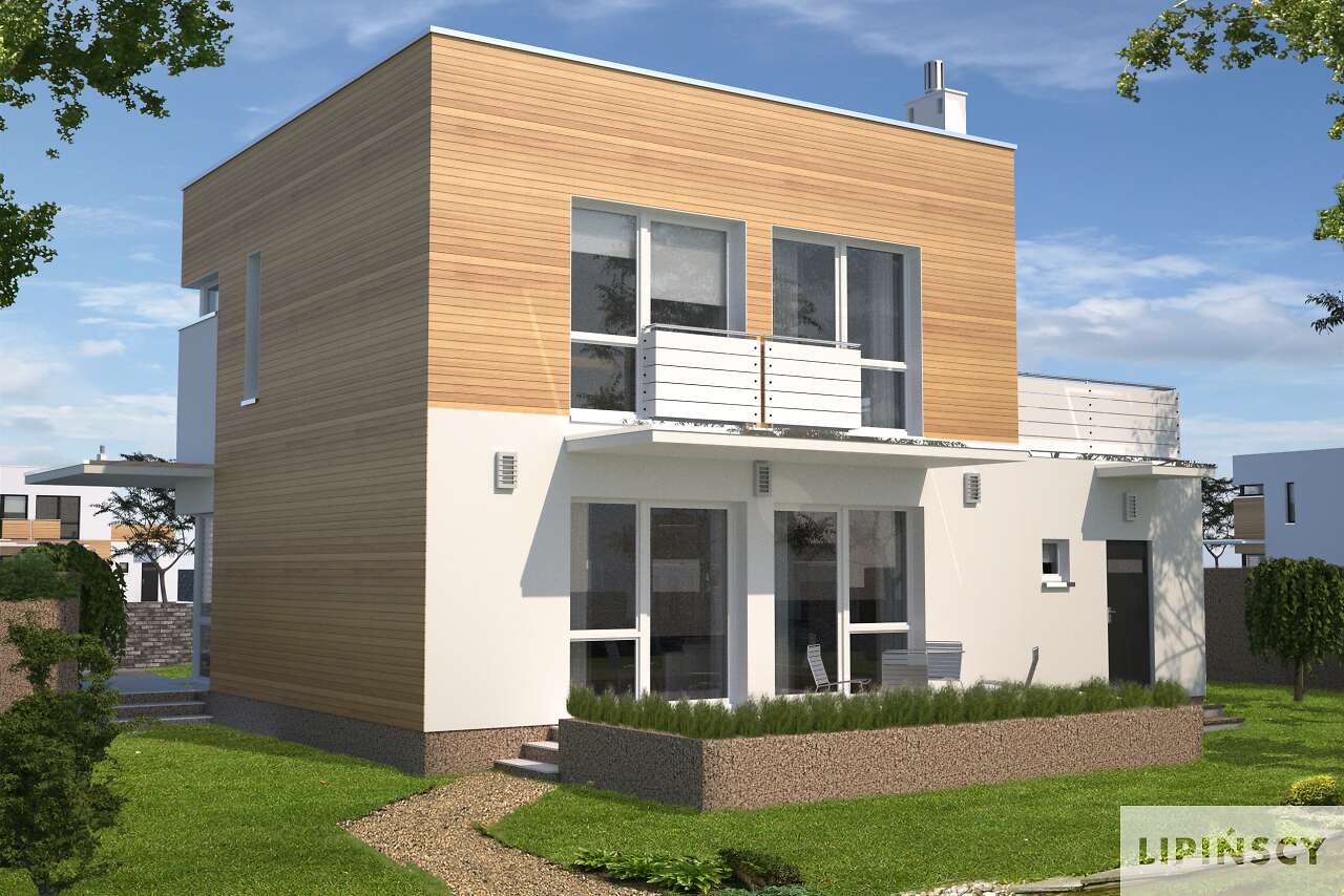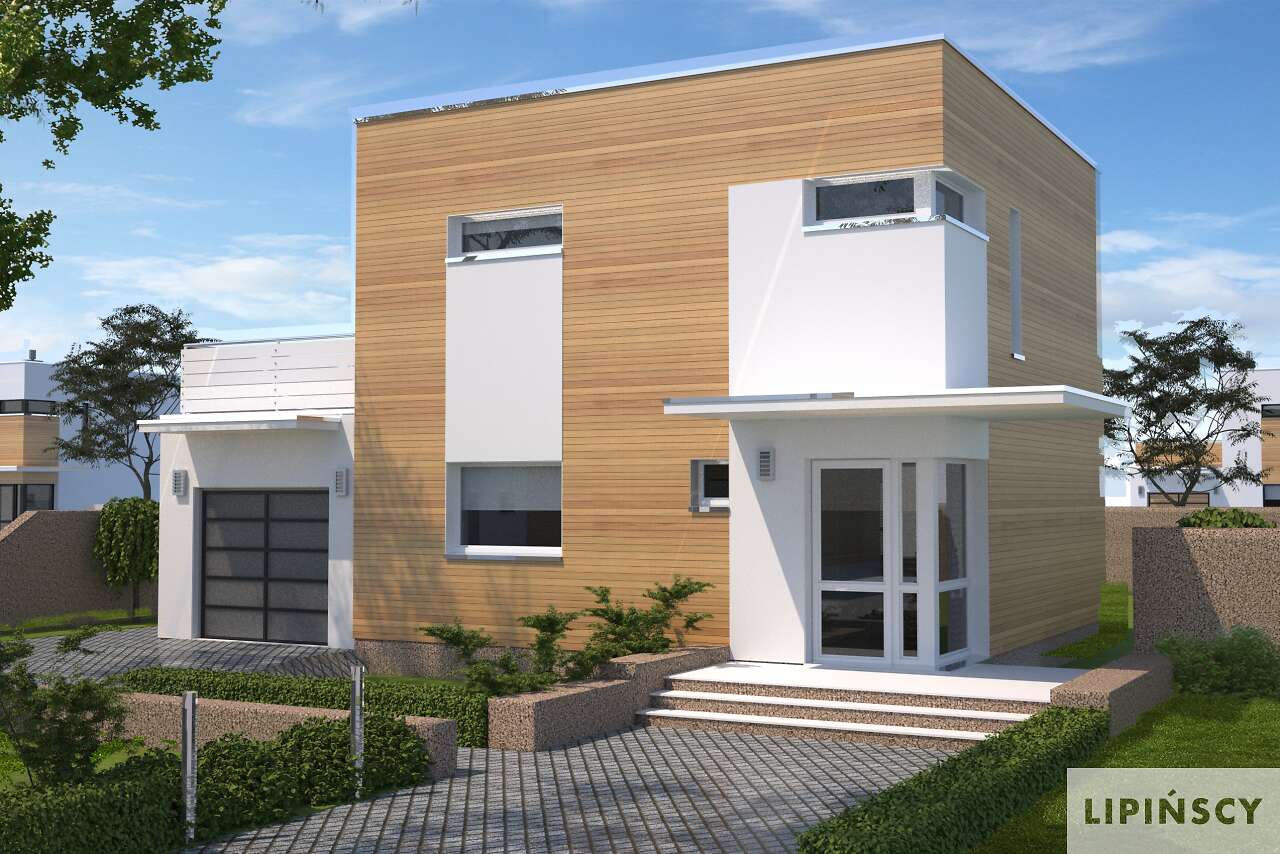 Niewielki, kompaktowy dom energooszczędny, idealny dla niewielkiej rodziny. Na parterze przewidziano obszerną strefę wspólną, z aneksem kuchennym i przeszklonym salonem z kominkiem. Pietro, będące wyraźnie oddzieloną strefą prywatną zajmują trzy ustawne sypialnie i wygodna łazienka. Ozdobą domu jest taras zlokalizowany na dachu jednostanowiskowego garażu, skąd można wejść z dwóch sypialni. Z nowoczesną, prostą bryłą doskonale komponują się drewniane elementy elewacji.