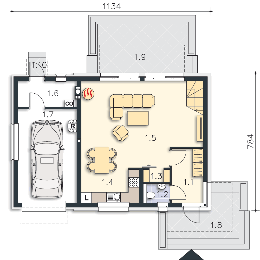 Można zrezygnować z garażu przy domu, ale wtedy trzeba przenieść kocioł gazowy oraz znaleźć miejsce dla rekuperatora, który jest umieszczony w garażu. Kocioł gazowy można umieścić jako wiszący np. w łazience lub w kuchni, a rekuperator w pomieszczeniu 1.3 albo przy wejściu w wiatrołapie z jakąś obudową.