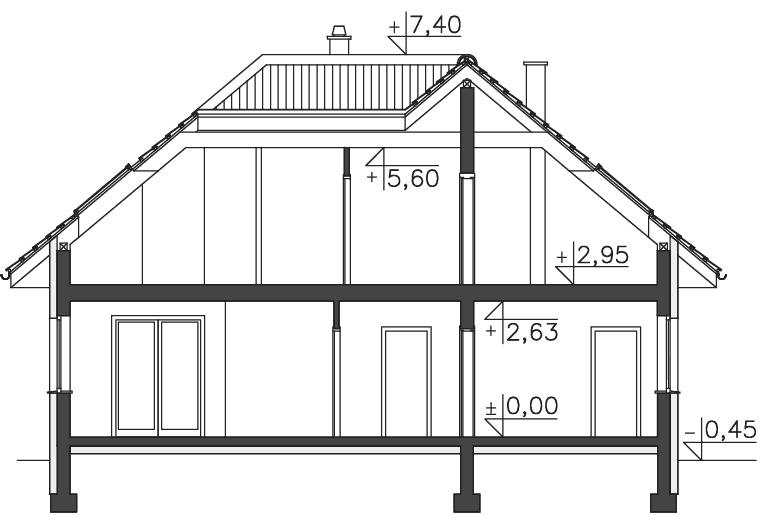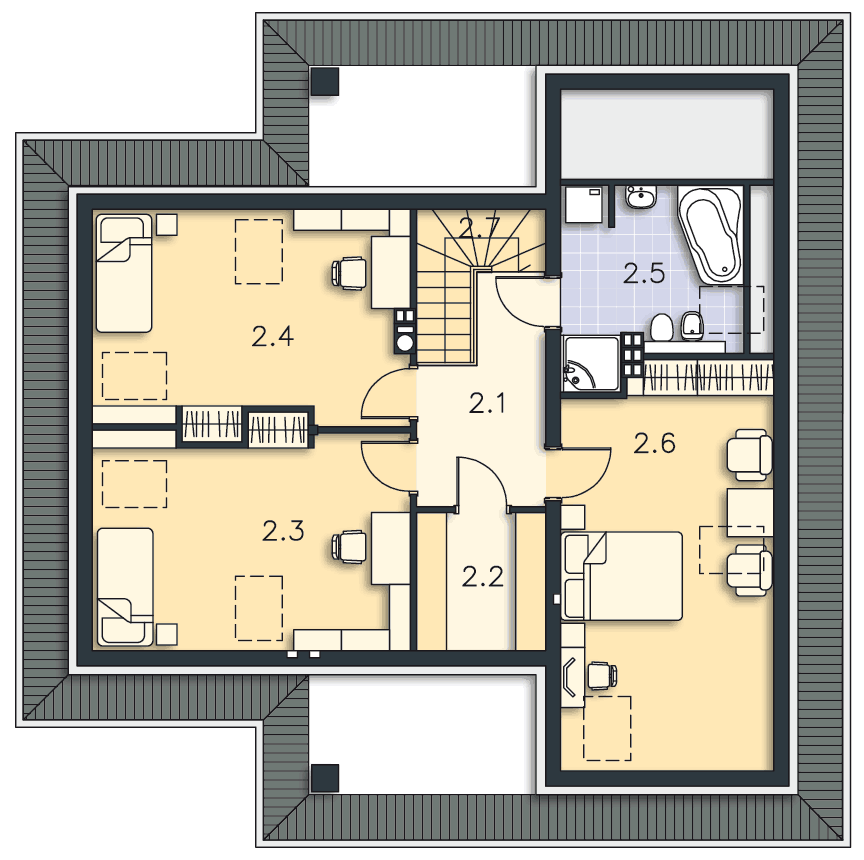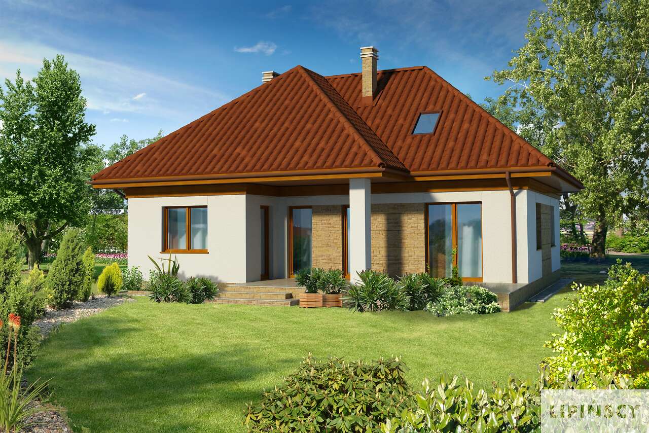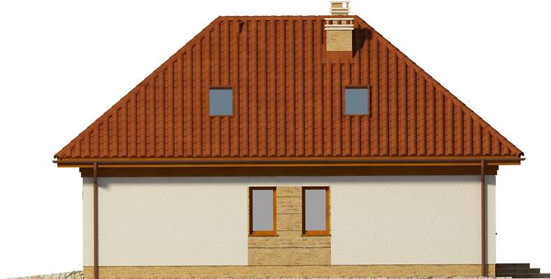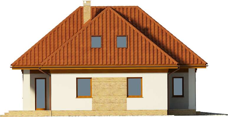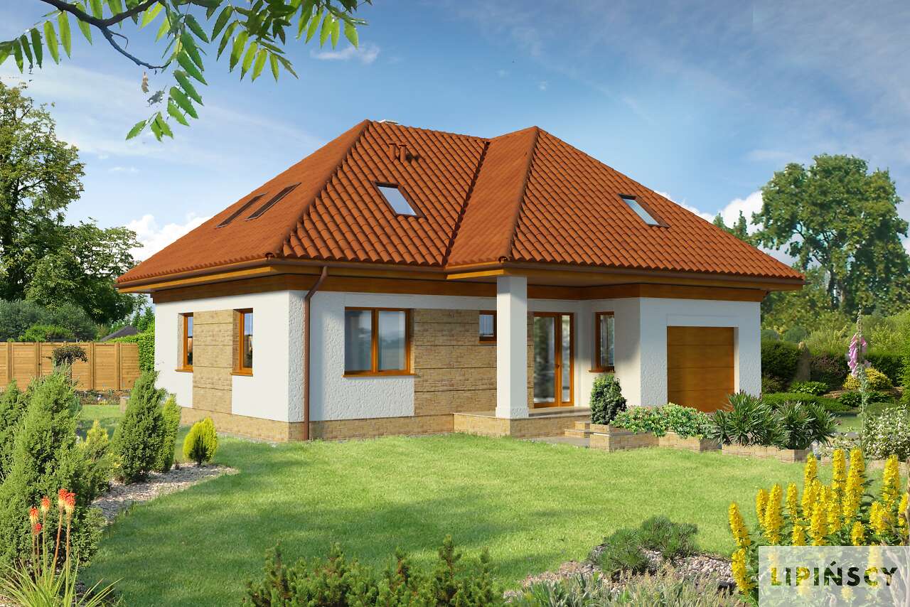 Piękny dom, z użytkowym poddaszem, o niebanalnym wyglądzie. Wielospadowy dach, ciekawe detale architektoniczne, pięknie skomponowana elewacja to tylko niektóre z atutów tego projektu. Na parterze zaprojektowano duży salon z kominkiem, który może być doskonałym miejscem do rodzinnego spędzania czasu, obszerną kuchnię, w której można wygospodarować część jadalną, wc oraz dodatkowy pokój, mogący służyć jako gabinet lub pokój gościnny. Dom jest połączony bezpośrednio z garażem, z którego można przejść do wydzielonej kotłowni. Poddasze z trzema sypialniami garderobą i łazienką to wygodna strefa prywatna.