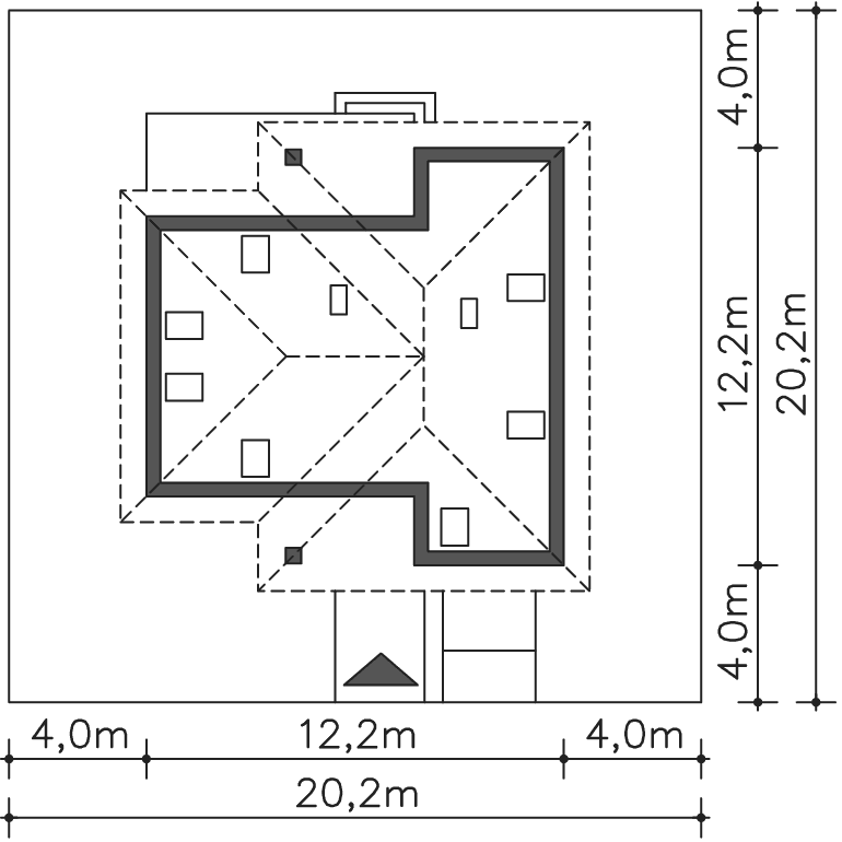 Grafika przedstawia minimalne wymiary działki. Aby sprawdzić, czy dom może być realizowany na konkretnej działce należy uzyskać Wypis i Wyrys z Miejscowego Planu Zagospodarowania Przestrzennego lub jeśli na danym terenie nie ma planu – Decyzję o warunkach zabudowy. Wszystkie projekty wymagają adaptacji do warunków miejscowych przez projektanta lokalnego.
