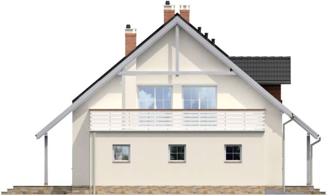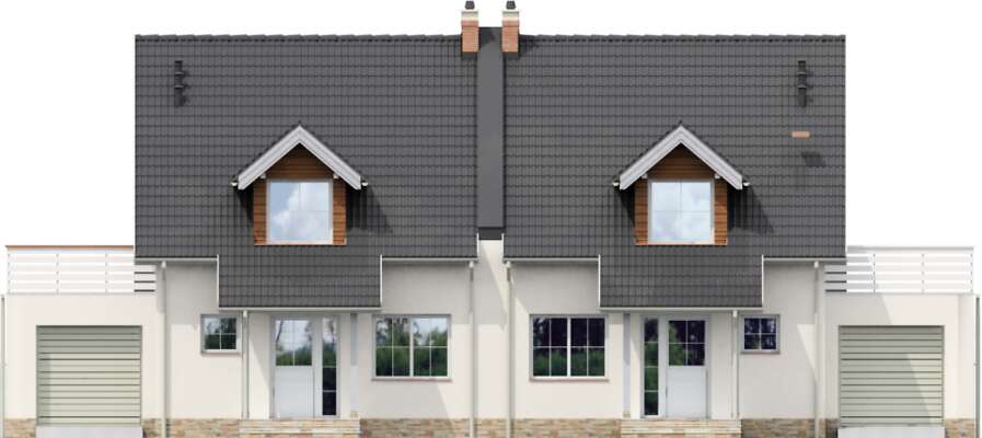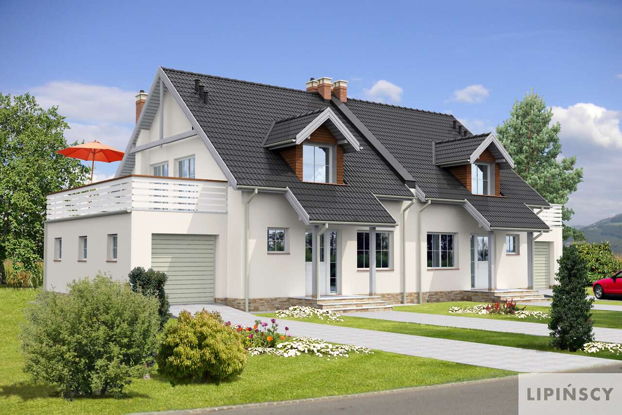 Typowy dom bliźniaczy funkcjonalnie zaplanowany dla czteroosobowej rodziny. Dom ten charakteryzuje się prostą architekturą i nieskomplikowanymi rozwiązaniami konstrukcyjnymi, co znacznie obniża koszty realizacji. Na parterze znajduje się duży salon, kuchnia z kątem do jedzenia i praktyczną spiżarką, pomieszczenie gospodarcze, w którym został umieszczony dwufunkcyjny kocioł gazowy oraz toaleta dostępna z wiatrołapu. Na poddaszu są trzy pokoje w tym jeden z garderobą, oraz łazienka. Dodatkowo nad garażem znajduje się taras dostępny z poddasza. Istnieją wersje projektu bez garażu i w zabudowie szeregowej.Dostępna także opcja projektu, w której kocioł gazowy jest w pomieszczeniu 1.3.