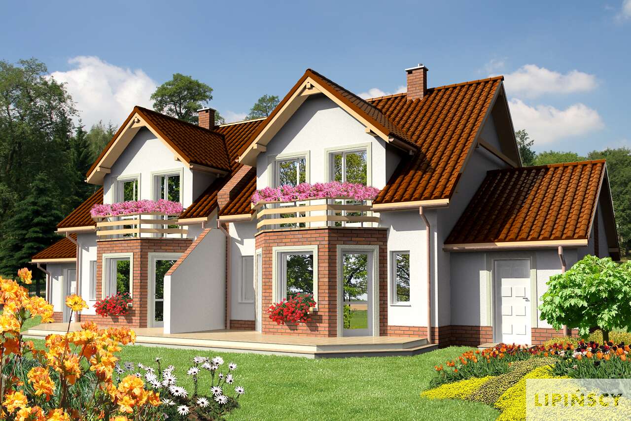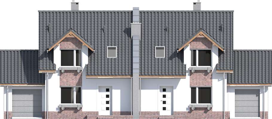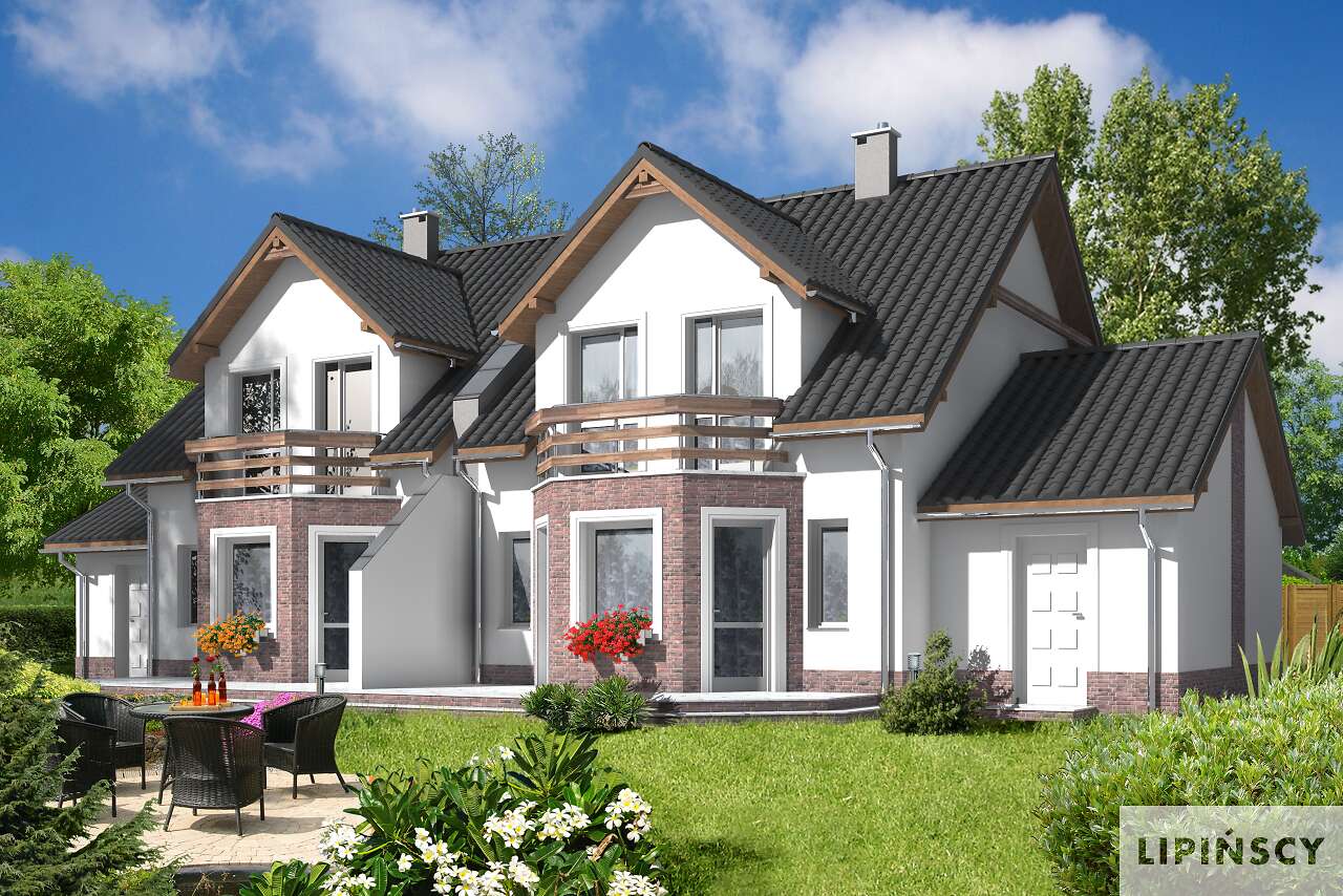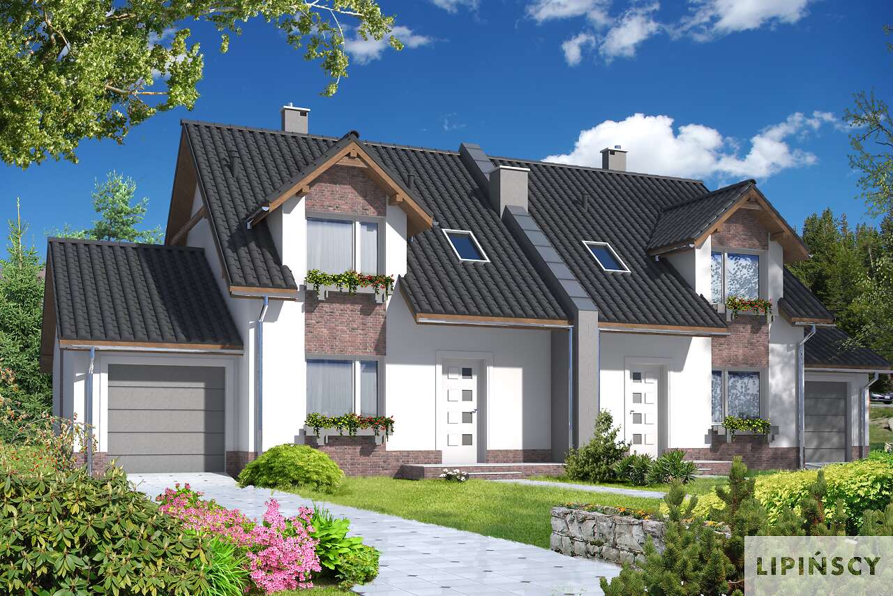 Jest to nieduży, aczkolwiek bardzo wygodny i pojemny dom przeznaczony do zabudowy bliźniaczej. Dzięki temu, że ściany szczytowe pozbawione są okien, bardzo dobrze nadaje się też do zabudowy szeregowej. Na parterze mieści się przestronny pokój dzienny z wykuszem, kuchnia ze spiżarnią, WCoraz garaż z pomieszczeniem gospodarczym na sprzęt ogrodniczy. Na poddaszu zlokalizowano trzy sypialnie, z których dwie mają wspólny balkonik od ogrodu, oraz łazienkę. Jest to znakomita kompozycja dla czteroosobowej rodziny ceniącej wygodę i stonowaną architekturę o doskonałych proporcjach i subtelnym wykończeniu. Dostępna jest również wersja projektu jako dom jednorodzinny dwulokalowy (ze wspólną ścianą pomiędzy segmentami).