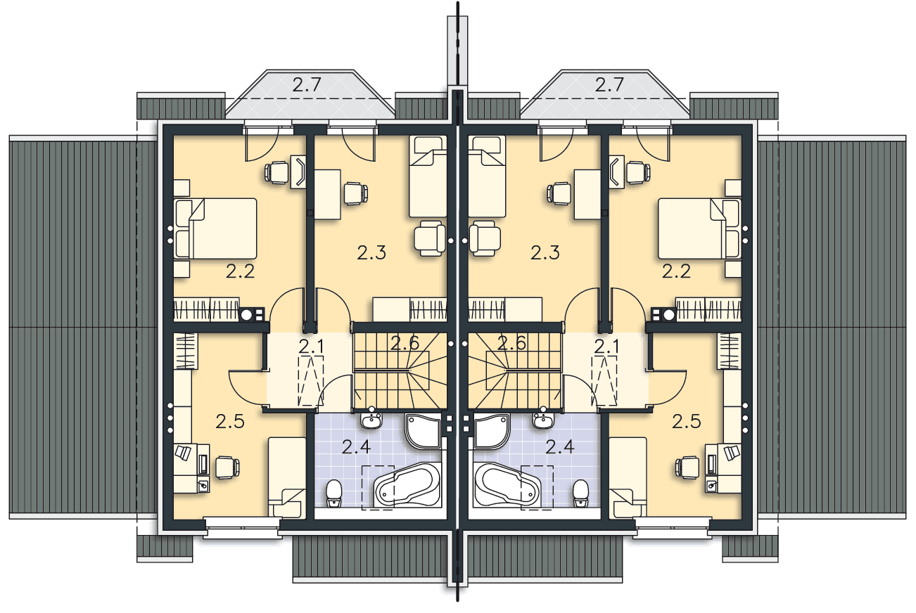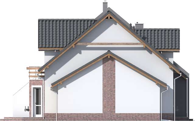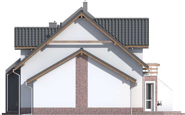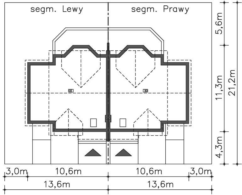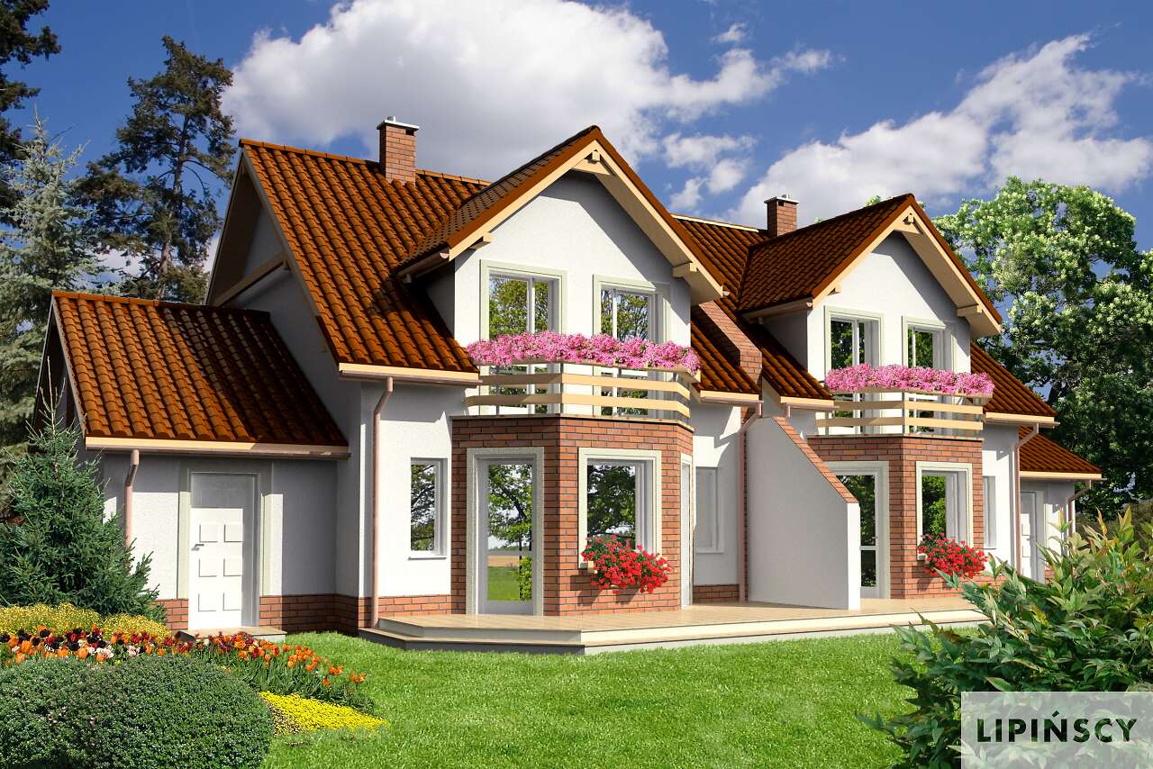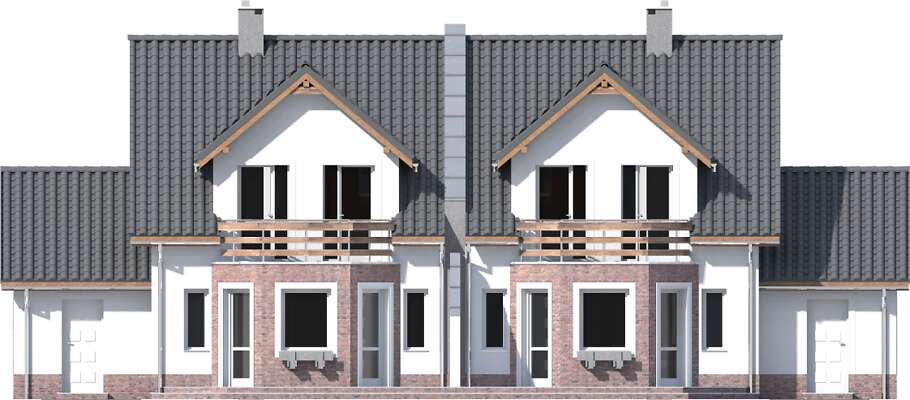 Jest to nieduży, aczkolwiek bardzo wygodny i pojemny dom przeznaczony do zabudowy bliźniaczej. Dzięki temu, że ściany szczytowe pozbawione są okien, bardzo dobrze nadaje się też do zabudowy szeregowej. Na parterze mieści się przestronny pokój dzienny z wykuszem, kuchnia ze spiżarnią, WCoraz garaż z pomieszczeniem gospodarczym na sprzęt ogrodniczy. Na poddaszu zlokalizowano trzy sypialnie, z których dwie mają wspólny balkonik od ogrodu, oraz łazienkę. Jest to znakomita kompozycja dla czteroosobowej rodziny ceniącej wygodę i stonowaną architekturę o doskonałych proporcjach i subtelnym wykończeniu. Dostępna jest również wersja projektu jako dom jednorodzinny dwulokalowy (ze wspólną ścianą pomiędzy segmentami).