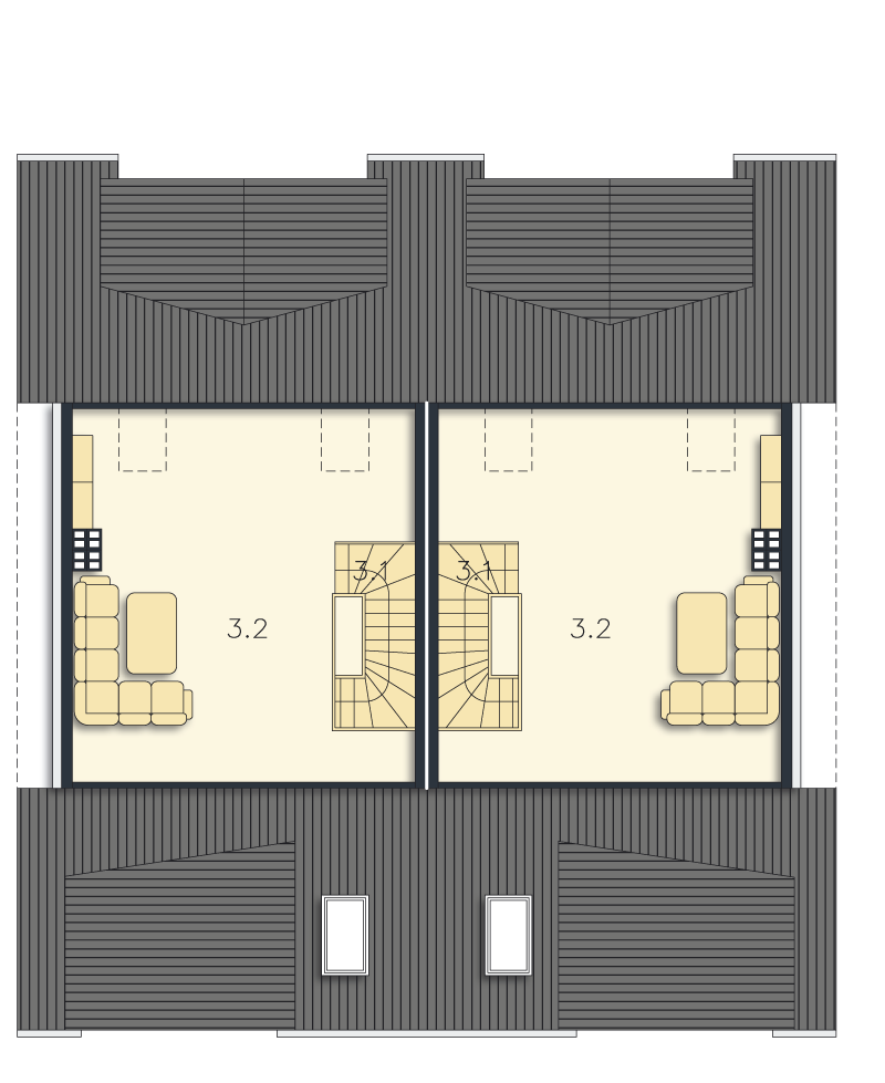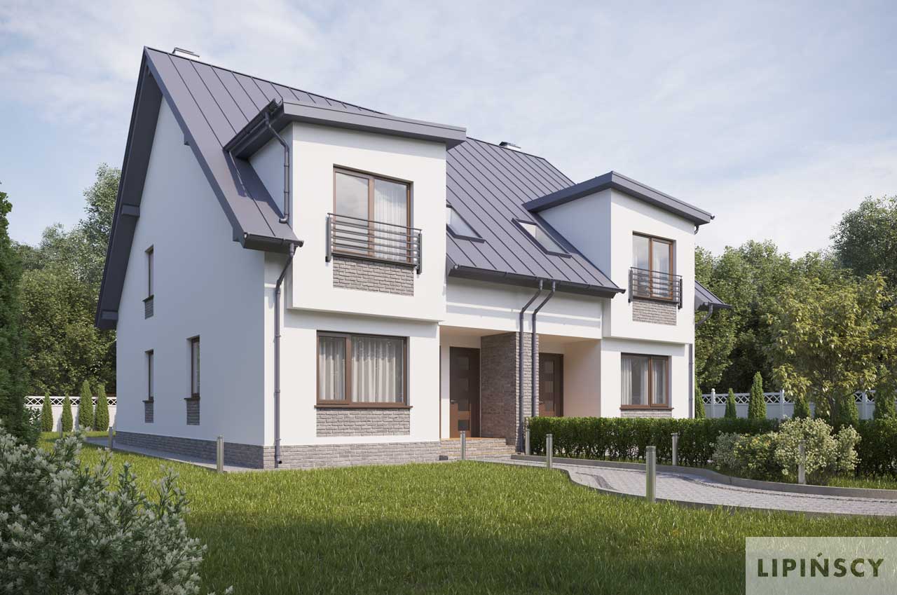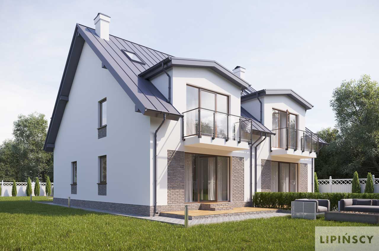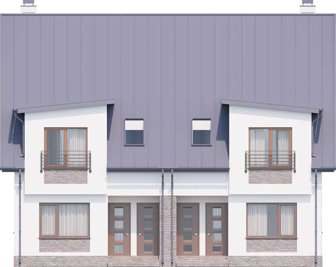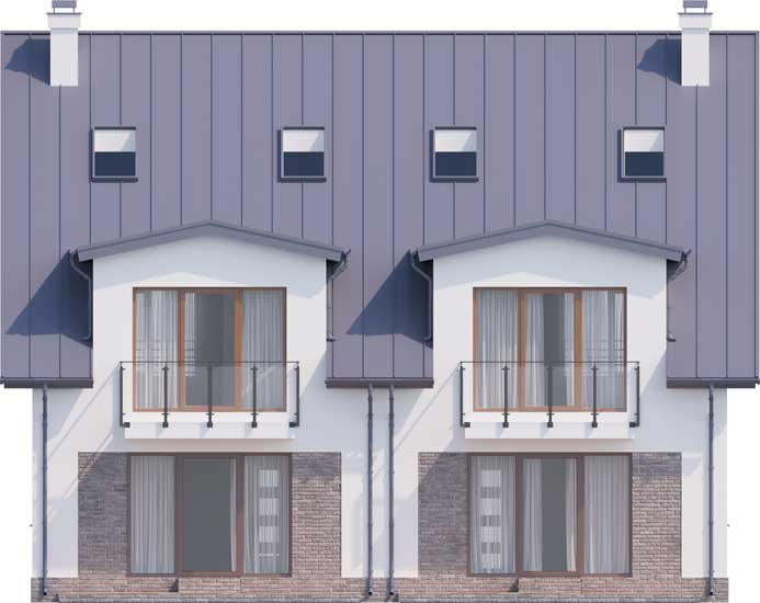 Propozycja domu jednorodzinnego dwulokalowego w zabudowie bliźniaczej. Mieszkania na parterze i piętrze składają się z pokoju dziennego z aneksem kuchennym, dwóch sypialni oraz łazienki, w której znajduje się piec zapewniający niezależne ogrzewanie każdemu z lokali. Mieszkanie na parterze posiada wyjście na taras, zaś domownicy na piętrze mają do dyspozycji balkon oraz studio na poddaszu. Zgrabna bryła budynku będzie się efektownie prezentować na osiedlach miejskich lub podmiejskich. Polecamy deweloperom.