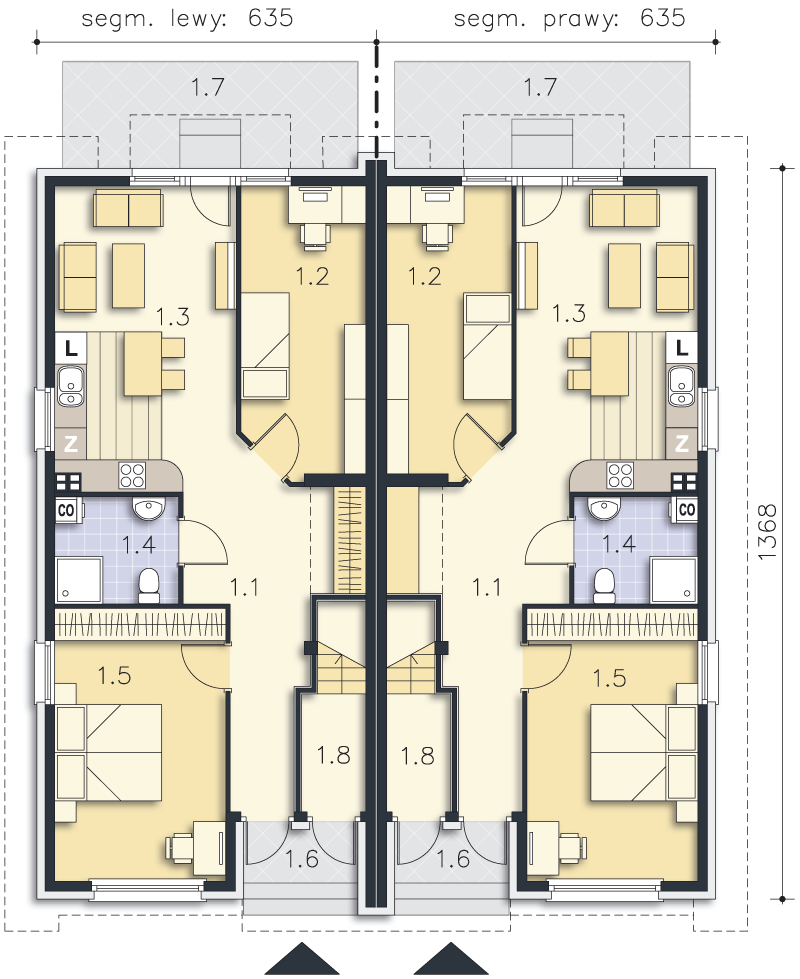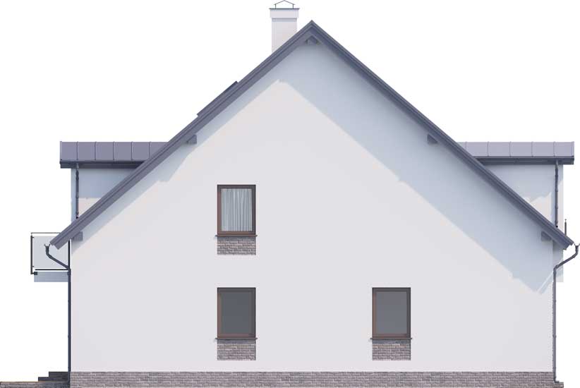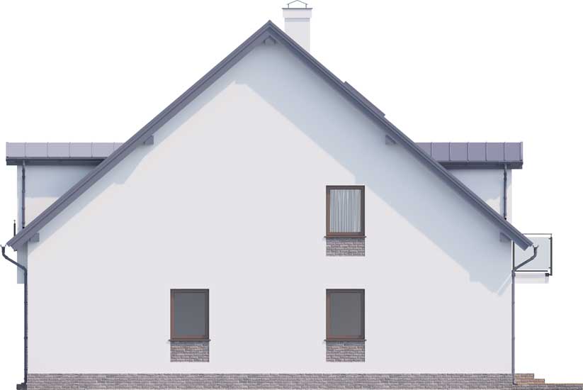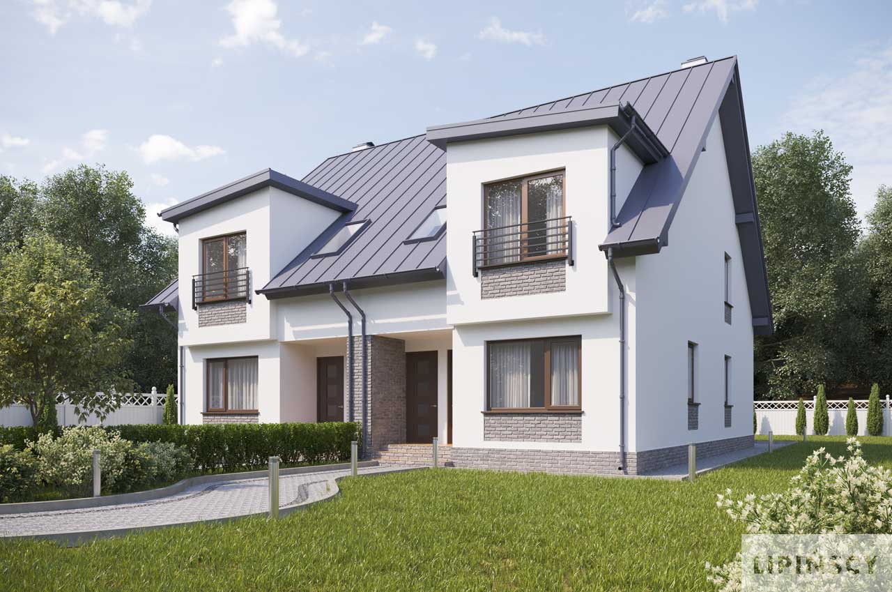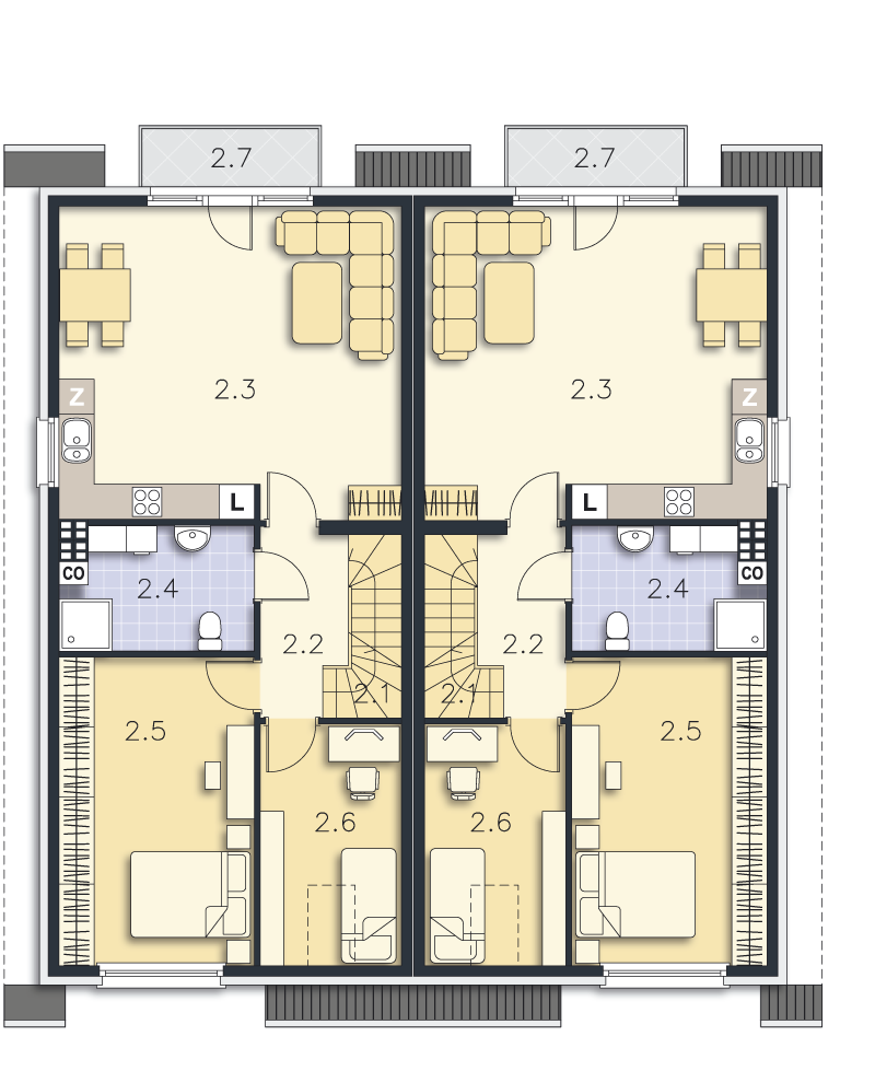 Propozycja domu jednorodzinnego dwulokalowego w zabudowie bliźniaczej. Mieszkania na parterze i piętrze składają się z pokoju dziennego z aneksem kuchennym, dwóch sypialni oraz łazienki, w której znajduje się piec zapewniający niezależne ogrzewanie każdemu z lokali. Mieszkanie na parterze posiada wyjście na taras, zaś domownicy na piętrze mają do dyspozycji balkon oraz studio na poddaszu. Zgrabna bryła budynku będzie się efektownie prezentować na osiedlach miejskich lub podmiejskich. Polecamy deweloperom.