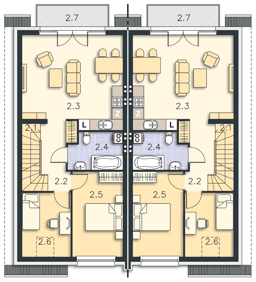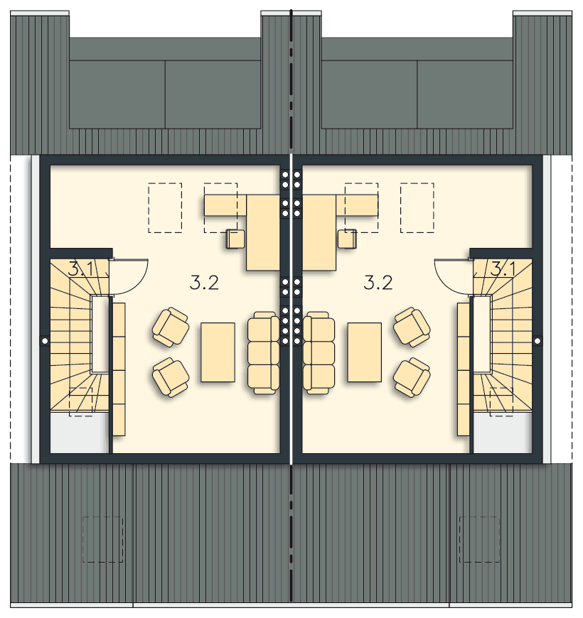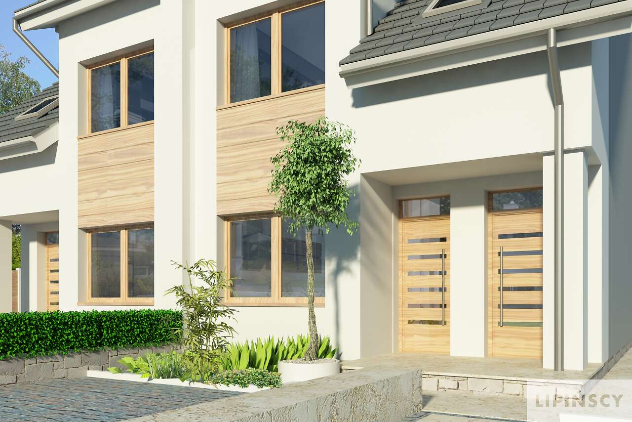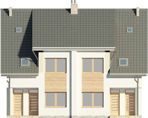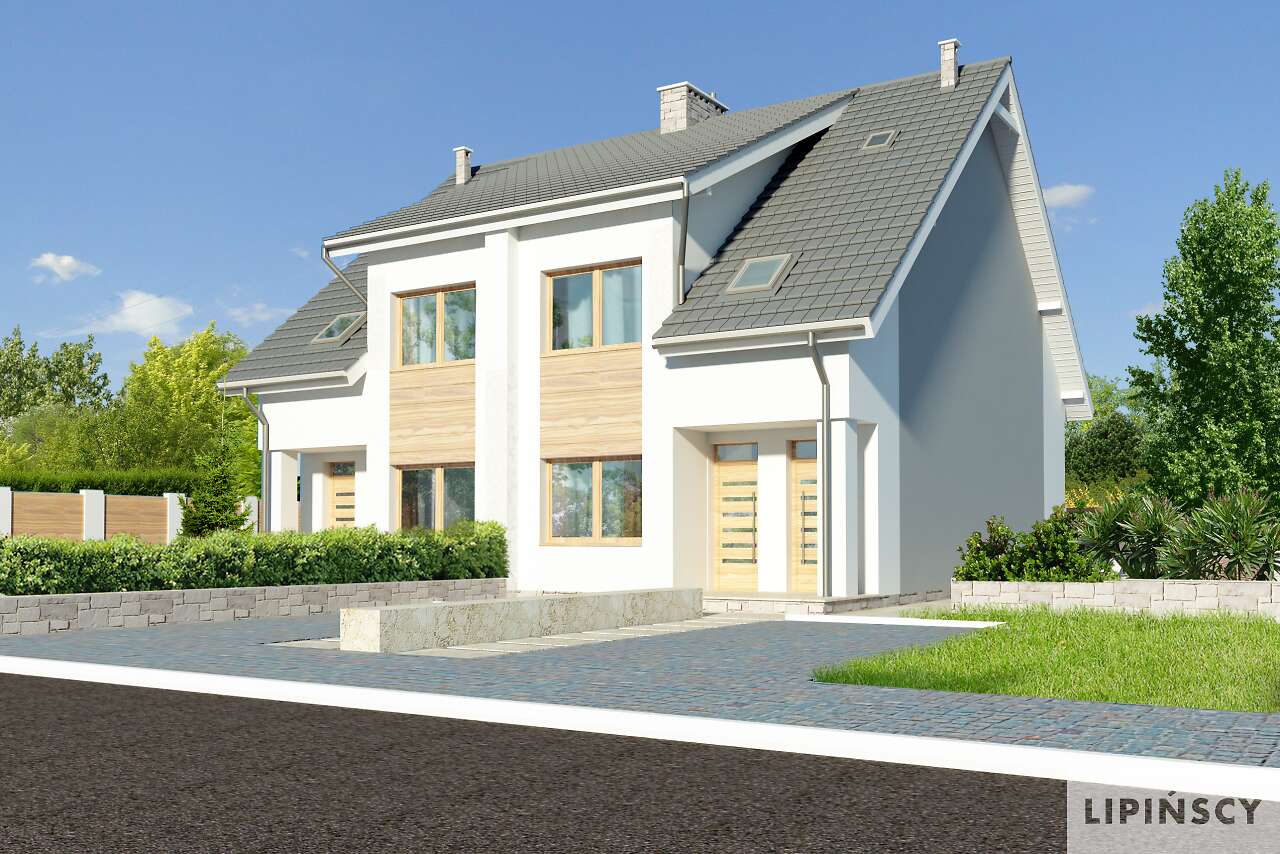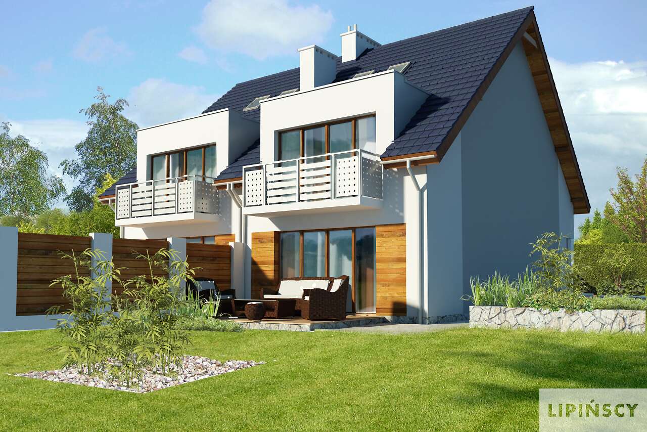 Energooszczędny dom jednorodzinny, w zabudowie bliźniaczej, z możliwością wydzielenia dwóch mieszkań. Pierwsze z nich, mniejsze – na parterze może należeć do seniorów, drugie zaś – na pierwszym i drugim piętrze (poddasze) – może być użytkowane przez większą rodzinę. Dzięki zastosowaniu dużych lukarn udało się zminimalizować skosy i uzyskać więcej powierzchni użytkowej. Nowoczesna architektura budynku sprawia, że projekt będzie się sprawdzał, zarówno w zabudowie szeregowej, jak i jako budynek bliźniaczy czy wolnostojący.